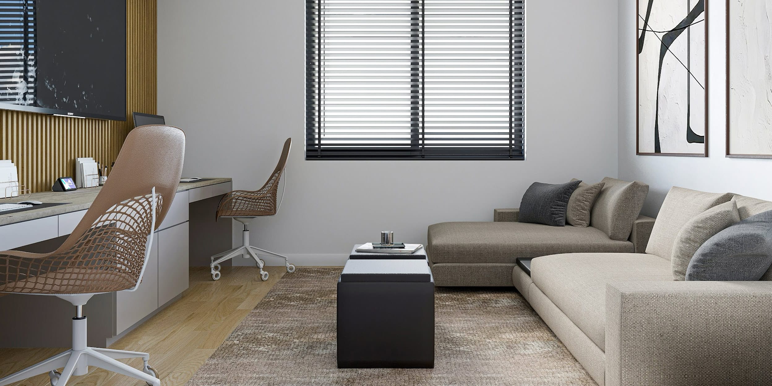To further soften the office wall and visually connect the space to other areas of the home, a wooden acoustic panel, similar to one displayed in our Sklar Studio, was added as the unit’s backdrop. The color palette remained calm and neutral, in line with the clients’ preferences. Paired with Guapa Office Chairs from MIDJ, the final design offered comfort, function, and a clean, modern aesthetic.