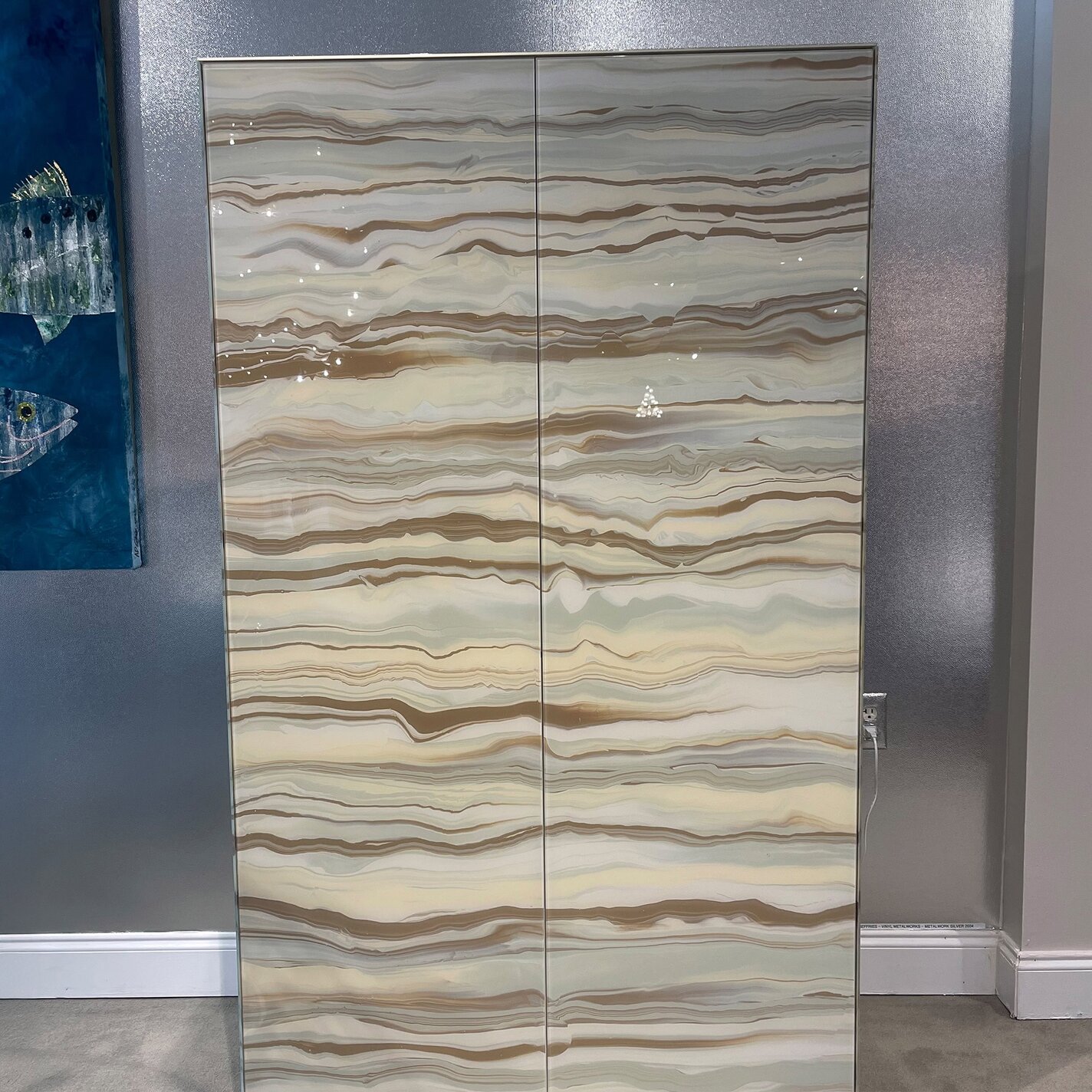 Using glass is a great way to bring in a contemporary bar for your home with color yet keeping it light and airy. Our Camila Bar, designed by Camila at Sklar Furnishings and produced by Glassismo does just this. Using glass on the front and side panels, it creates a gorgeous centerpiece for your home. Looking like a piece of artwork, the doors easily pop open to reveal your bar filled with shelves, a beverage center and storage. When not in use, this piece looks like an exquisite cabinet.