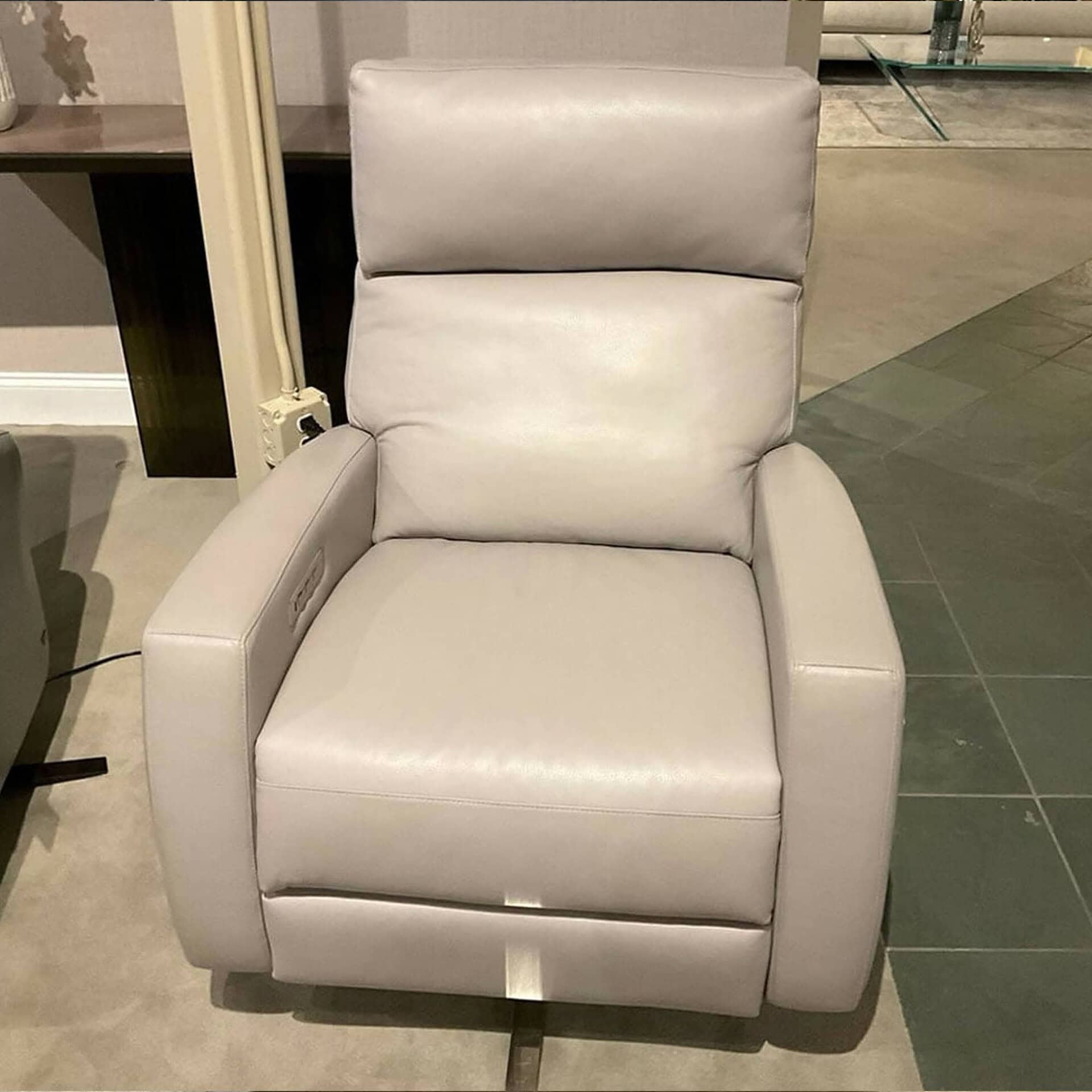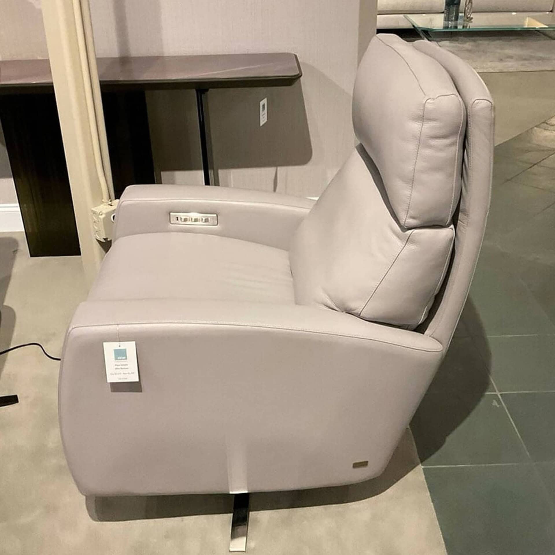 Power recliner with a foam seat and a polished nickel four-star base, upholstered in Capri Thundercloud (grey) leather.
