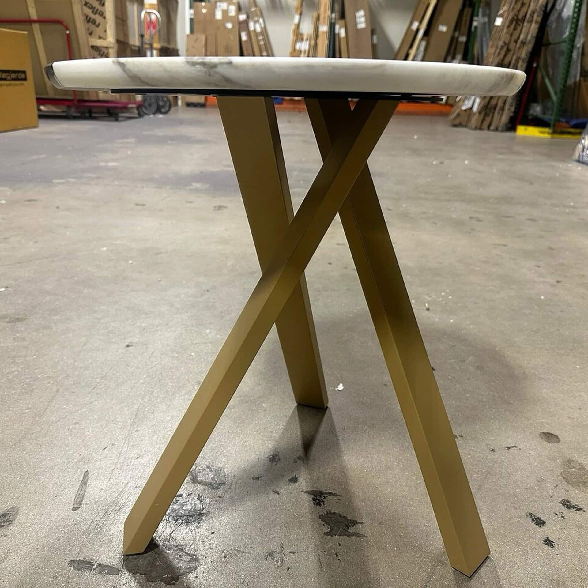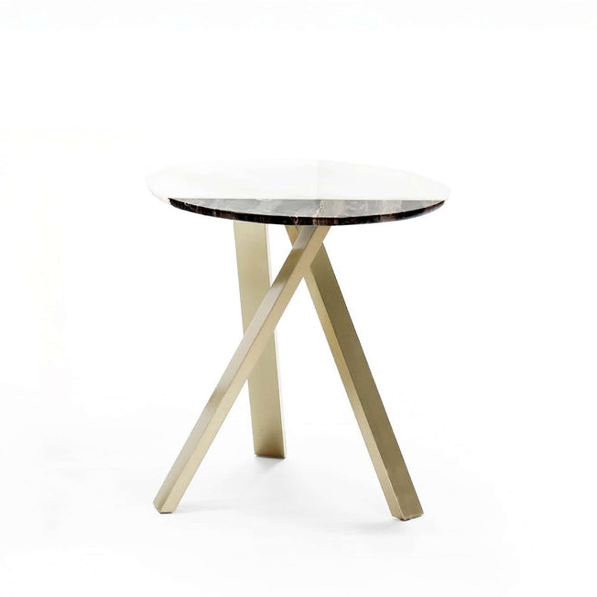 A statement piece from Italy’s Borzalino, this round cocktail table features a striking two-marble top divided by a polished brass inlay. Set on crossed gold-finish metal legs, it blends sculptural design with refined materials for bold, modern elegance.