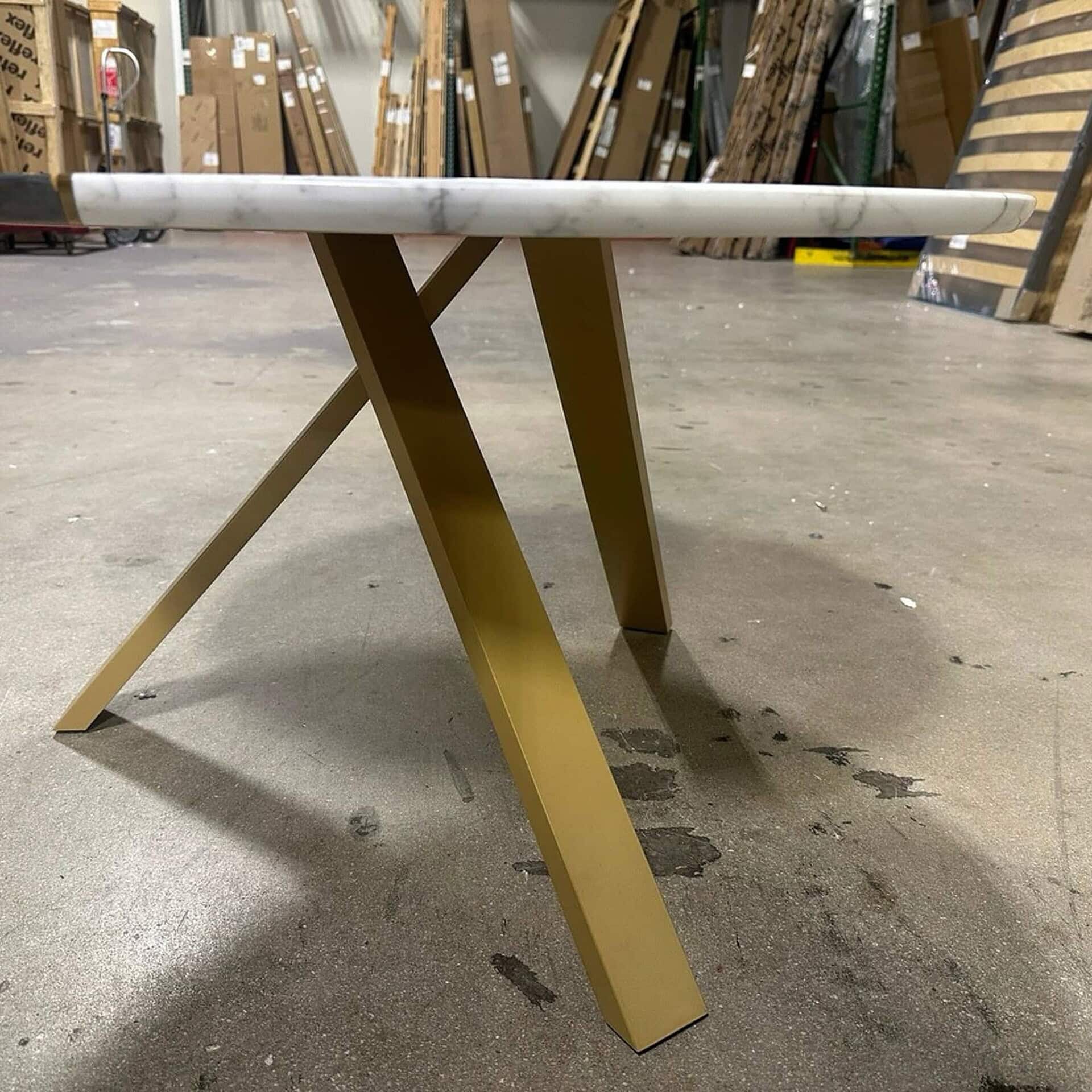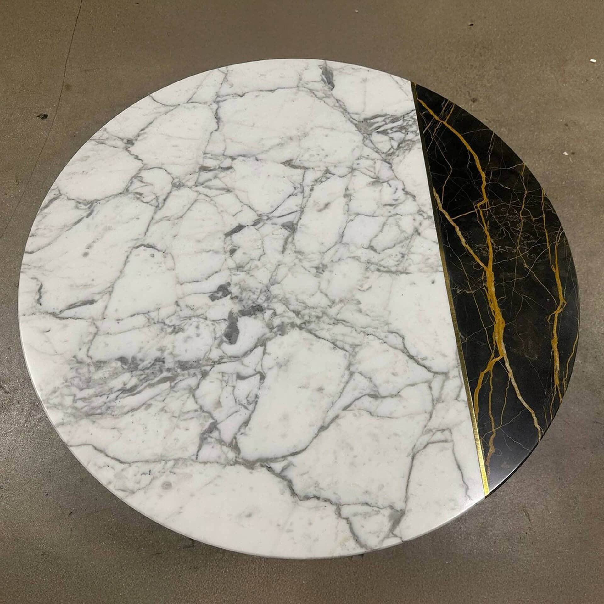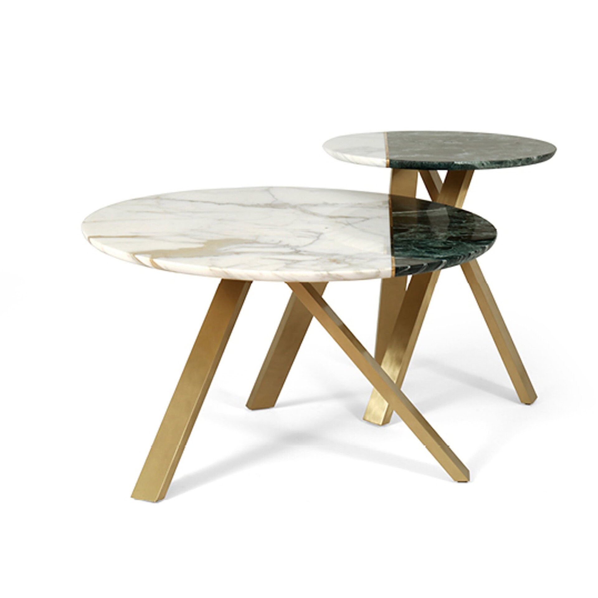 A statement piece from Italy’s Borzalino, this round cocktail table features a striking two-marble top divided by a polished brass inlay. Set on crossed gold-finish metal legs, it blends sculptural design with refined materials for bold, modern elegance.