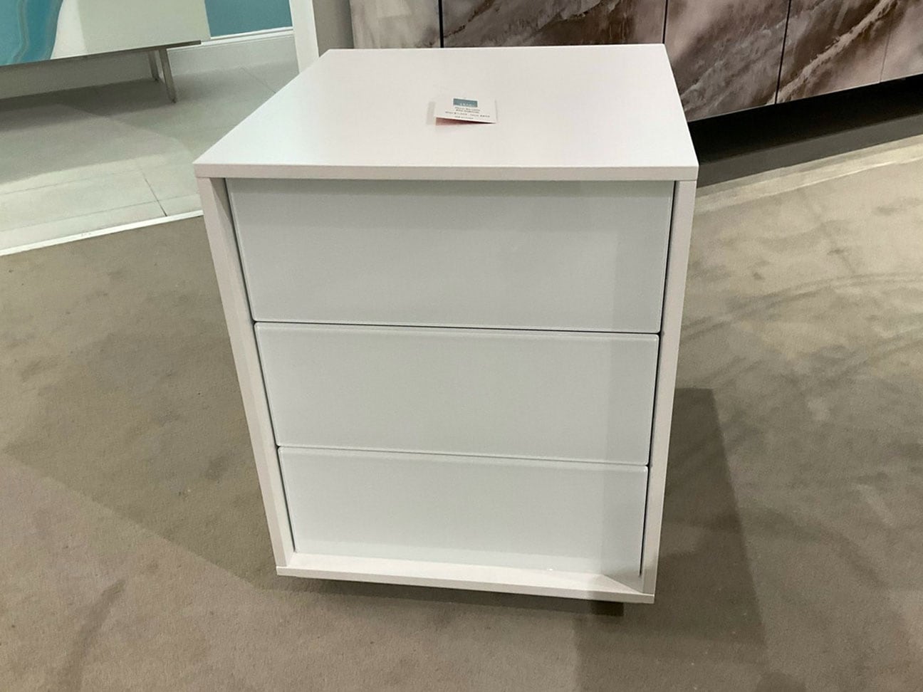3 drawer cabinet with white matt lacquer. Drawer fronts in white varnished glass.