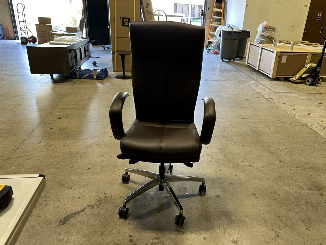 Executive office chair in tobacco leather. Syncro control with seat slide and polished aluminum base.