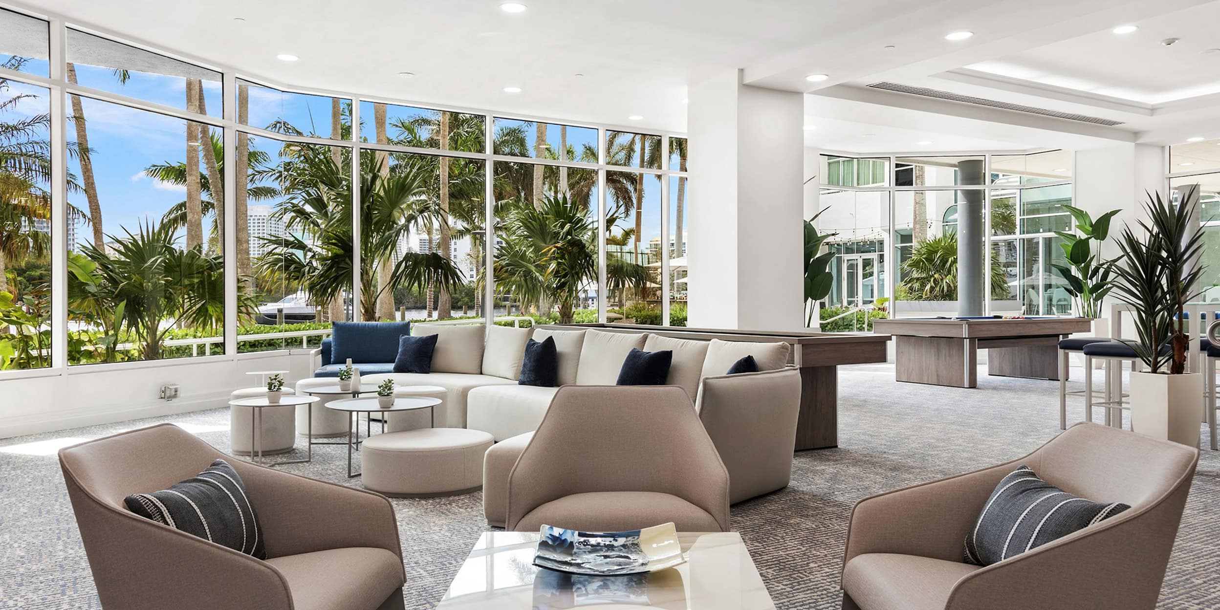 GALLERYone is a condo hotel that overlooks the intercoastal waterway at the Sunrise Bridge in Fort Lauderdale. The Highrise was built in 1986 and has 256 units, that are mainly one bedroom. The goal for this project was to update the common area spaces and create a warm and inviting feel by the water. The project included the front desk, a coffee area, the restaurant, and bar. Linda Paton, our Vice President of Customer Relations was the lead designer on the project.