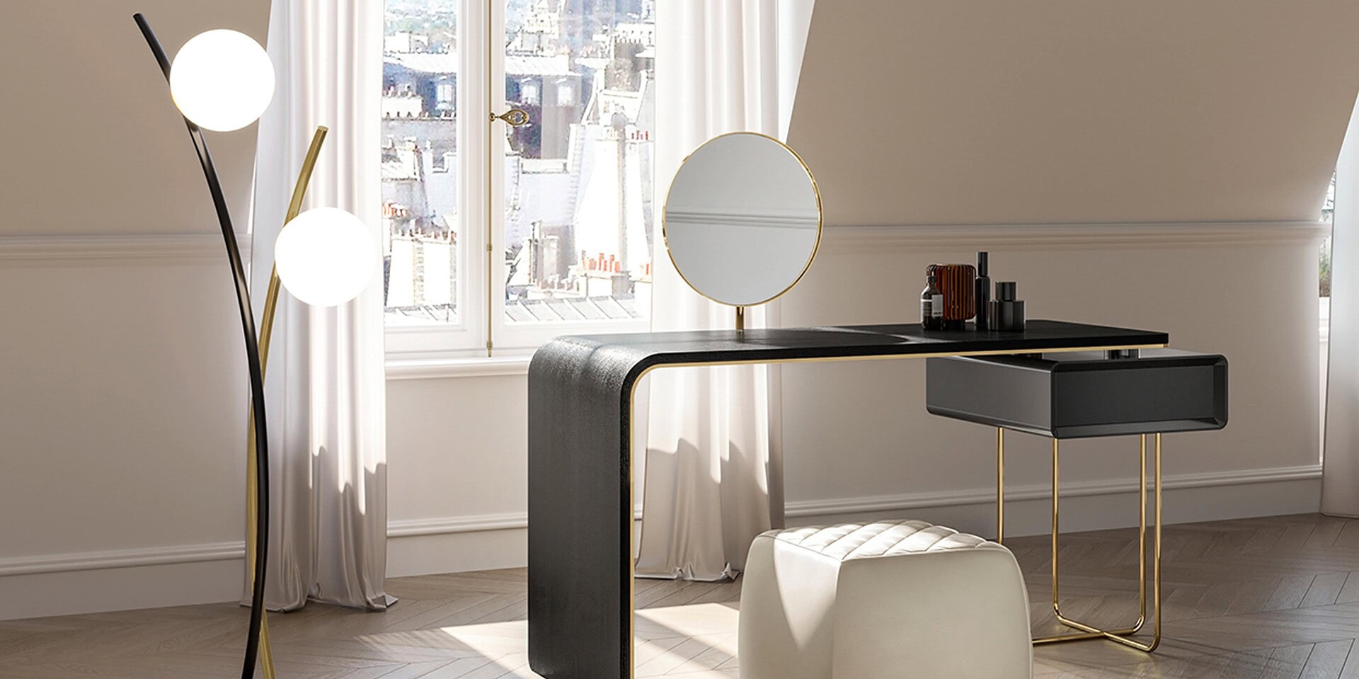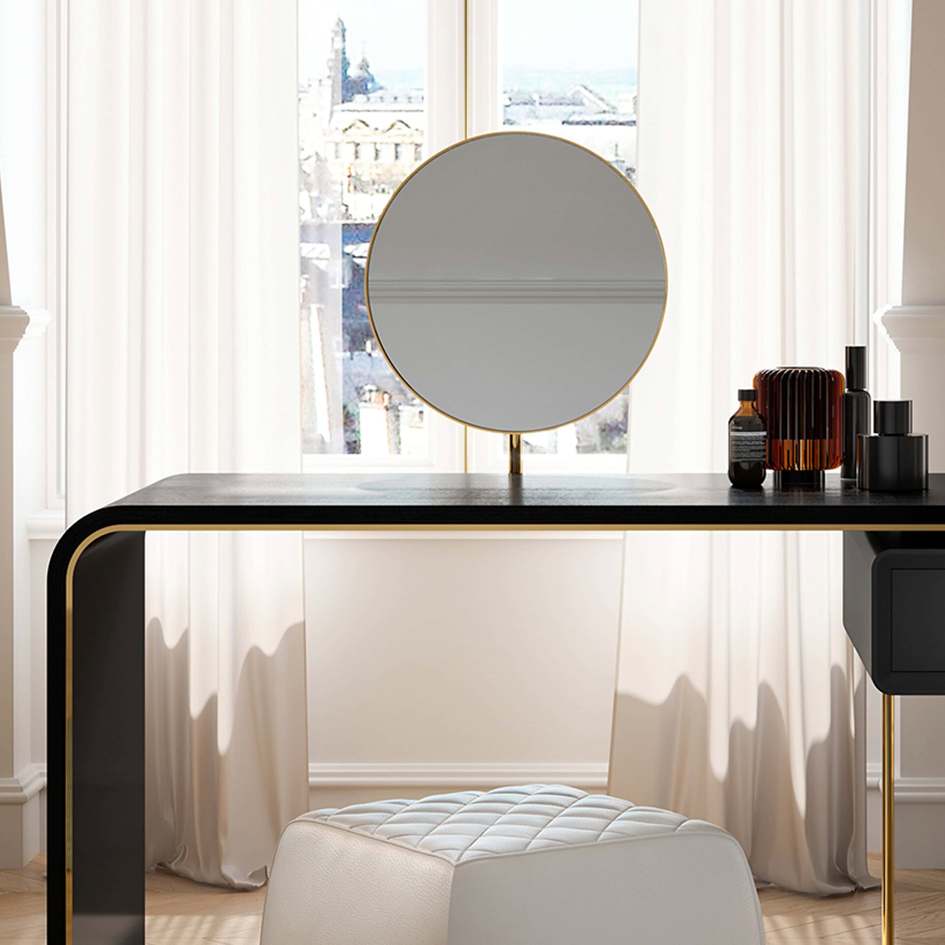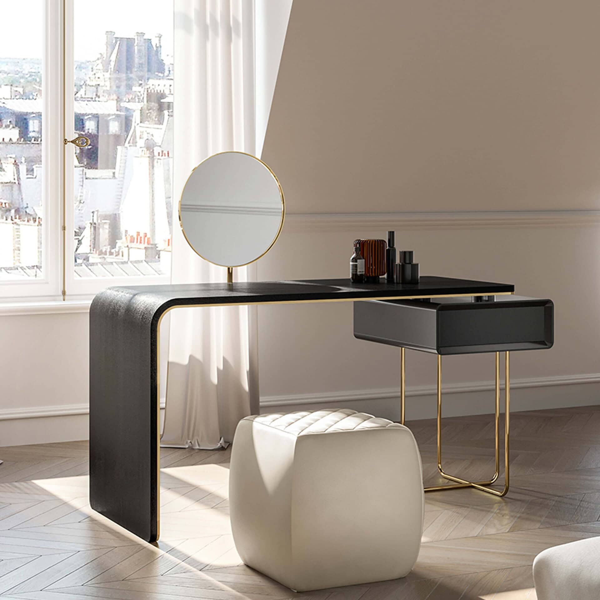 With a painted metal base, this dressing table features a drawer and an extra clear beveled mirror that is 6 mm thick. A veneered wood structure and a lacquered wood top are used for the construction of this table.
