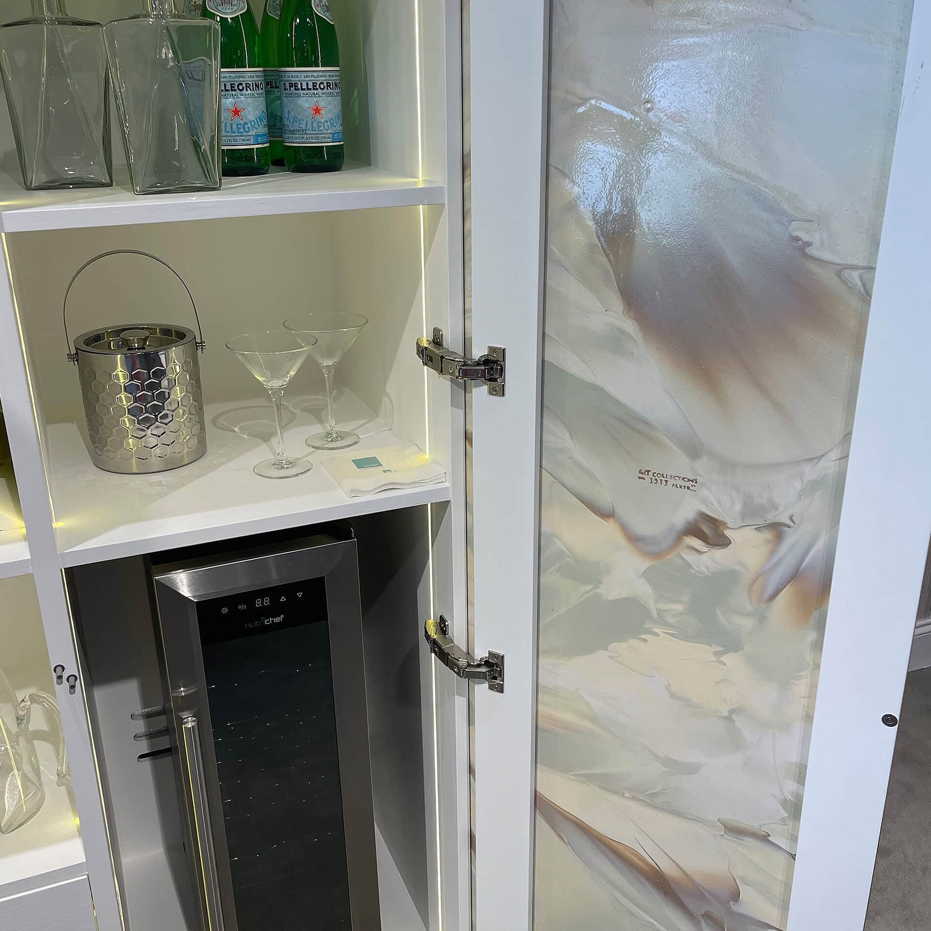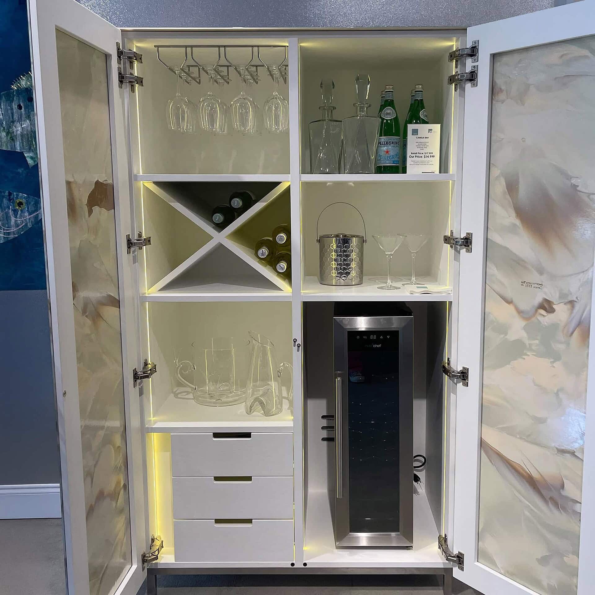 Interior: Adjustable shelving, bottle storage, optional mirrored backing