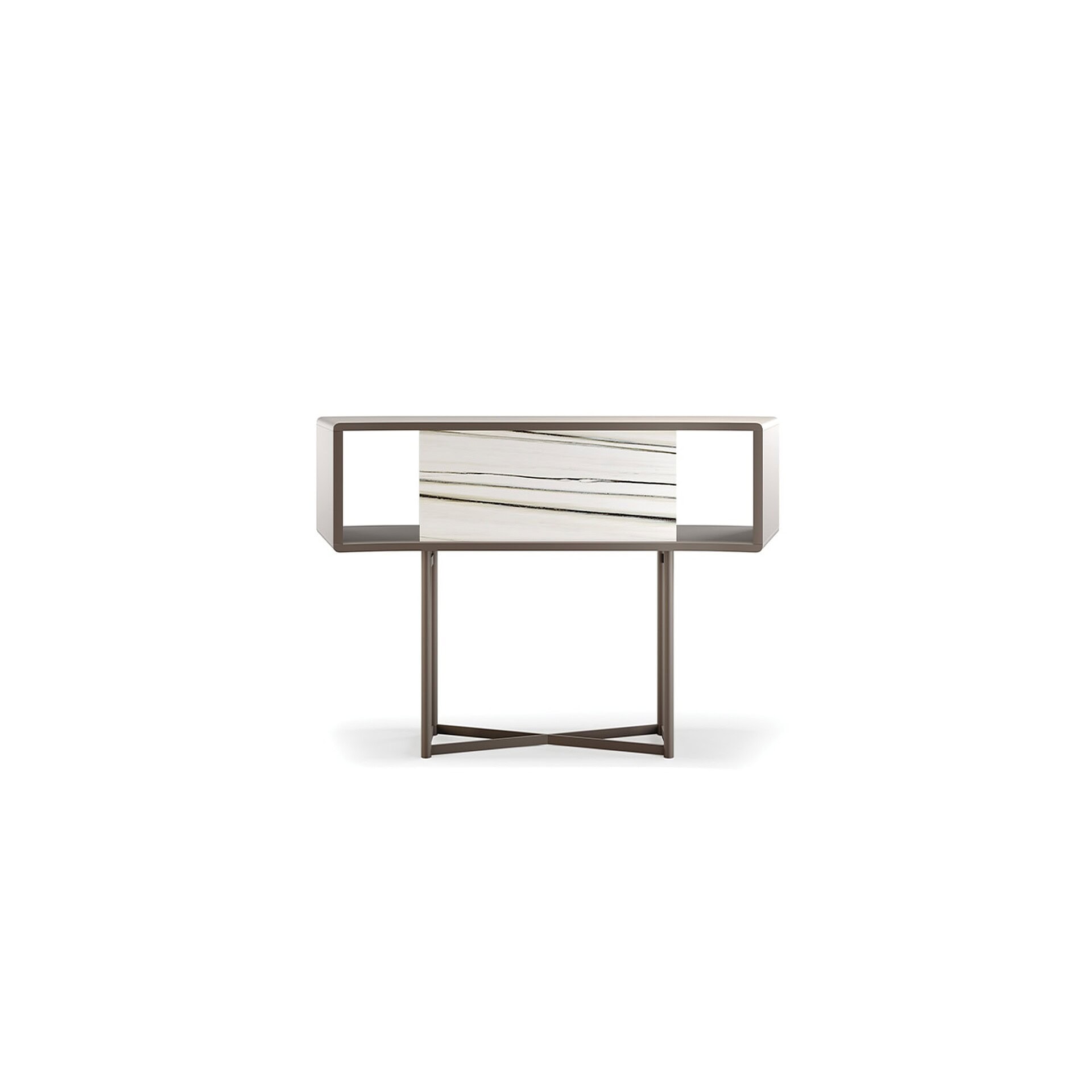 Structure available in wood finishes. Door panels are available in wood glass or marble glass. Base in satin dark brass or bronze metal finishes. Doors feature push-pull opening. Interior shelving in transparent glass.