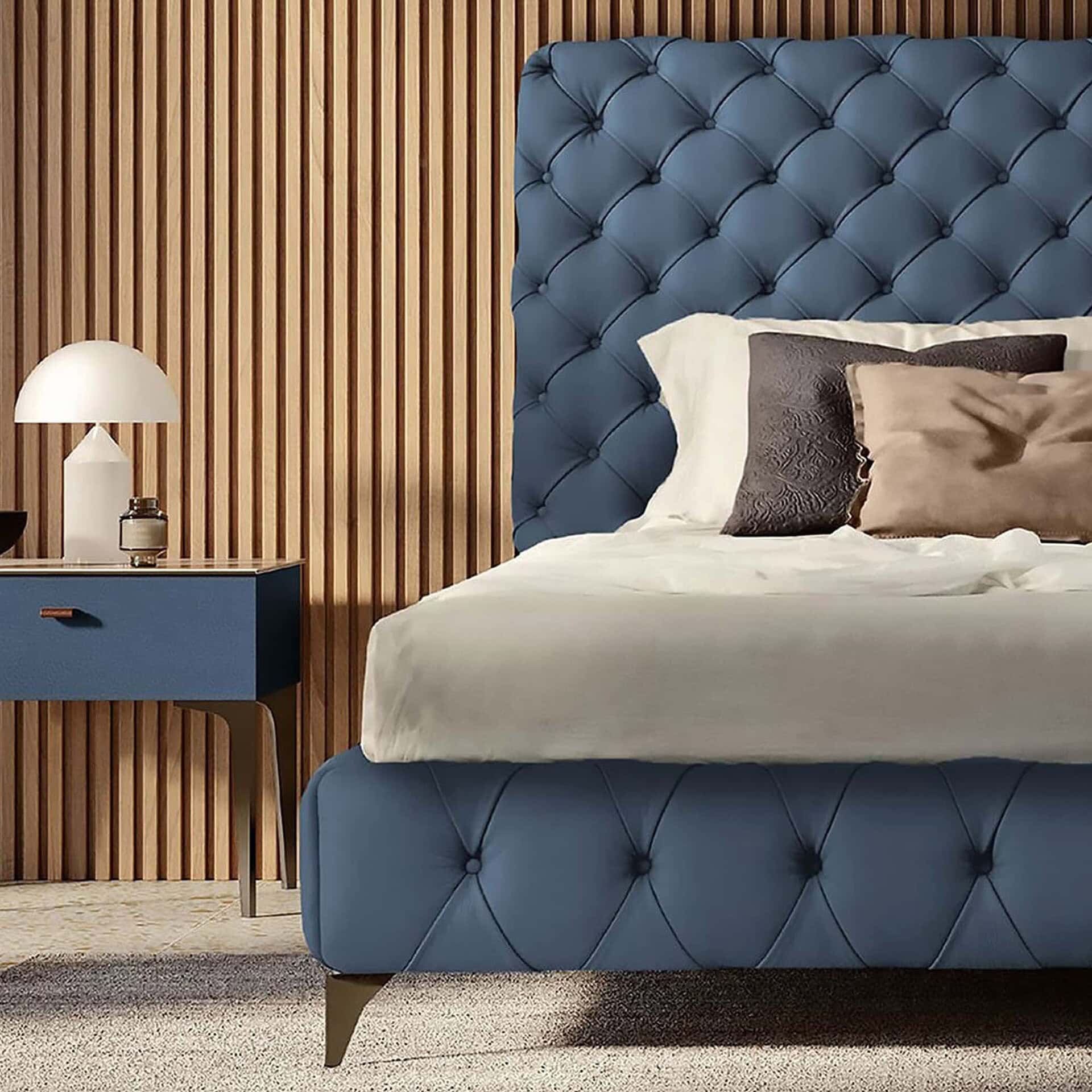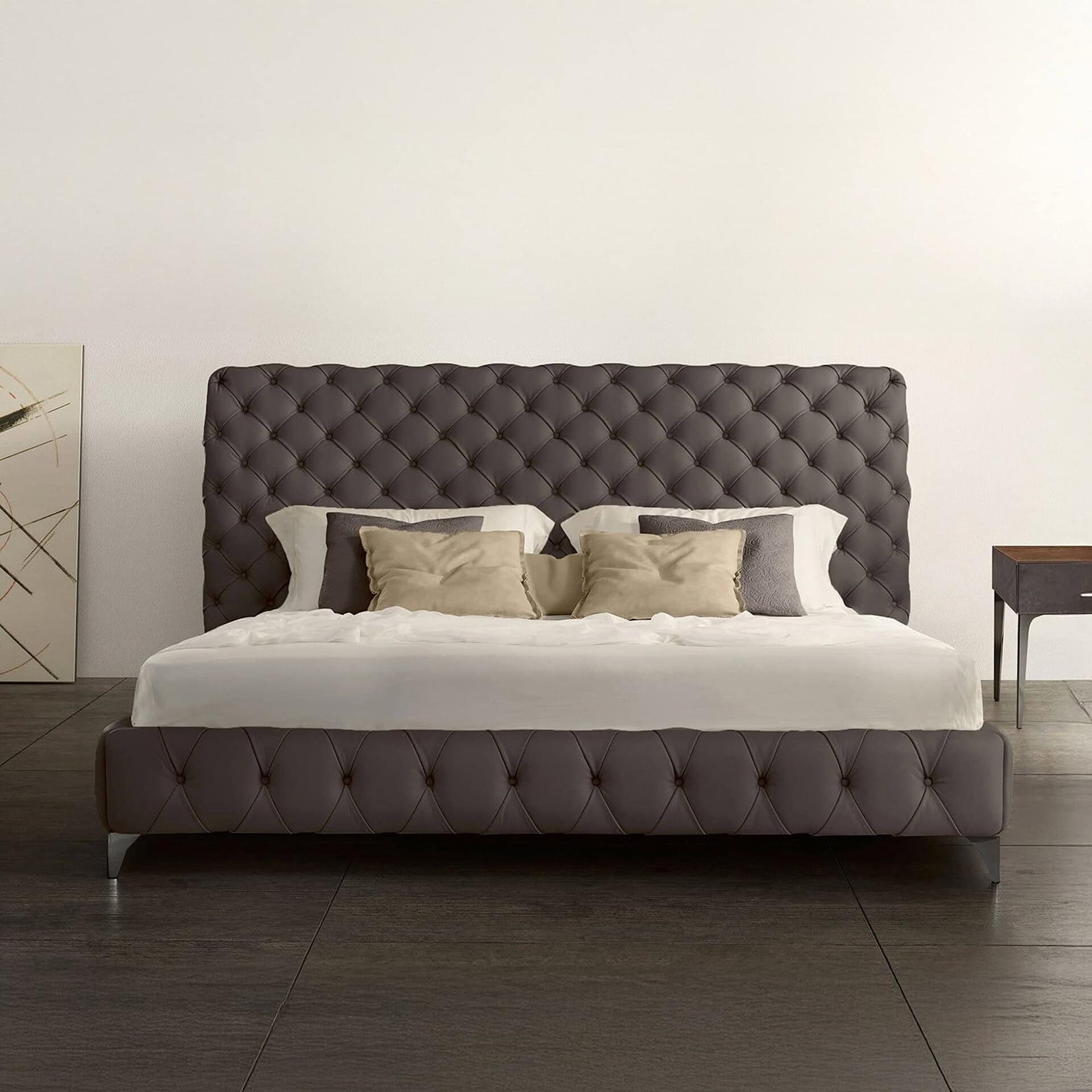 The Aston Alto Night Bed blends sophistication with signature Italian craftsmanship, showcasing Gamma's iconic handmade Capitonné upholstery. Its generous headboard rises to 139 cm (55") and creates a striking focal point, with precise tufting details that enhance its refined silhouette. Designed for comfort and timeless appeal, this piece is ideal for elegant bedrooms where style meets substance. A storage base with double movement functionality is available upon request, offering 18 cm (7") of usable space — a discreet solution for modern living.