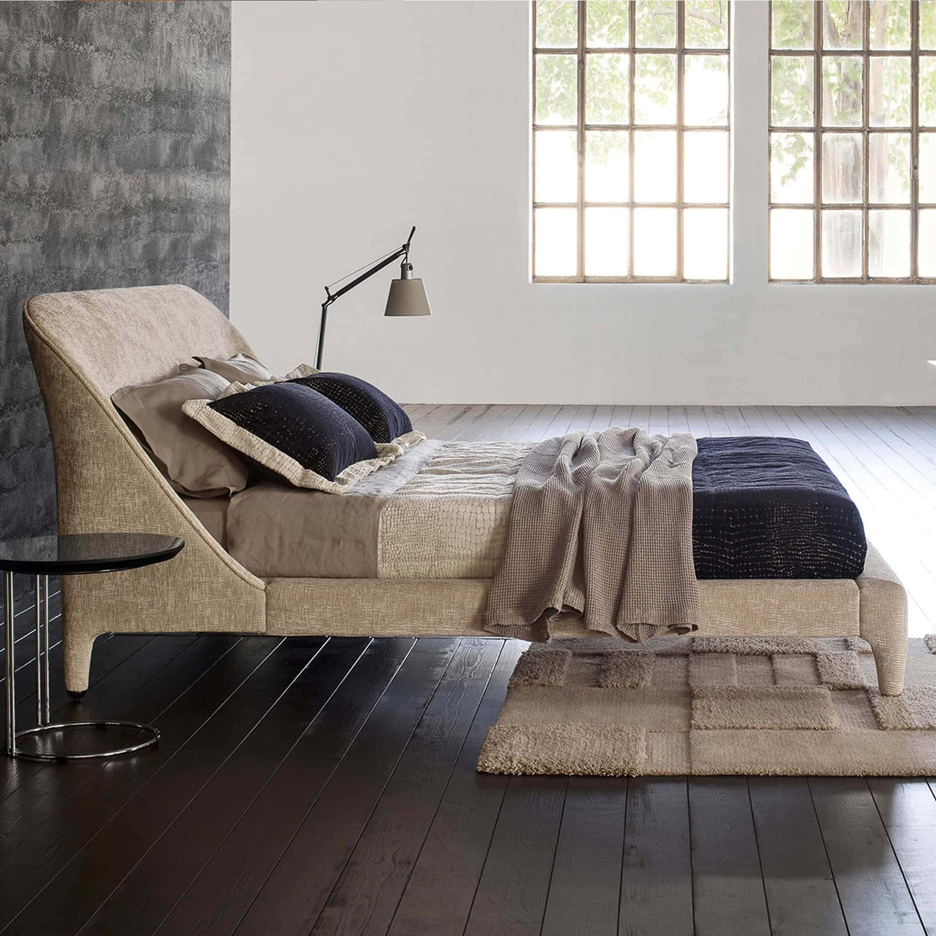 The headboard of this round bed is made of two curved parts and it is covered in fabrics and leather from the IL Loft collection.