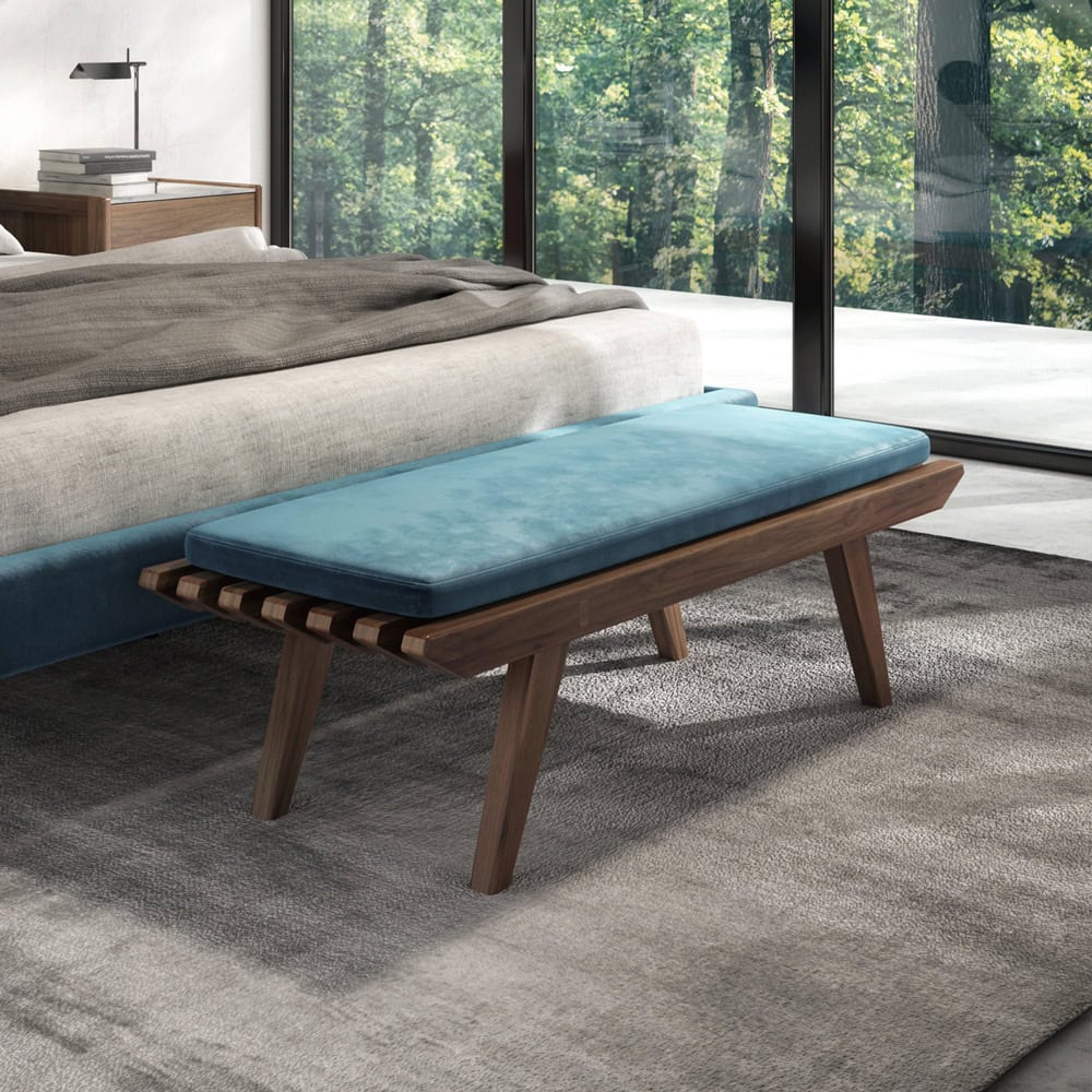Choose from a sophisticated palette of wood finishes and fabrics to customize the Frida Bench to your taste. Please speak with a design associate for more options.