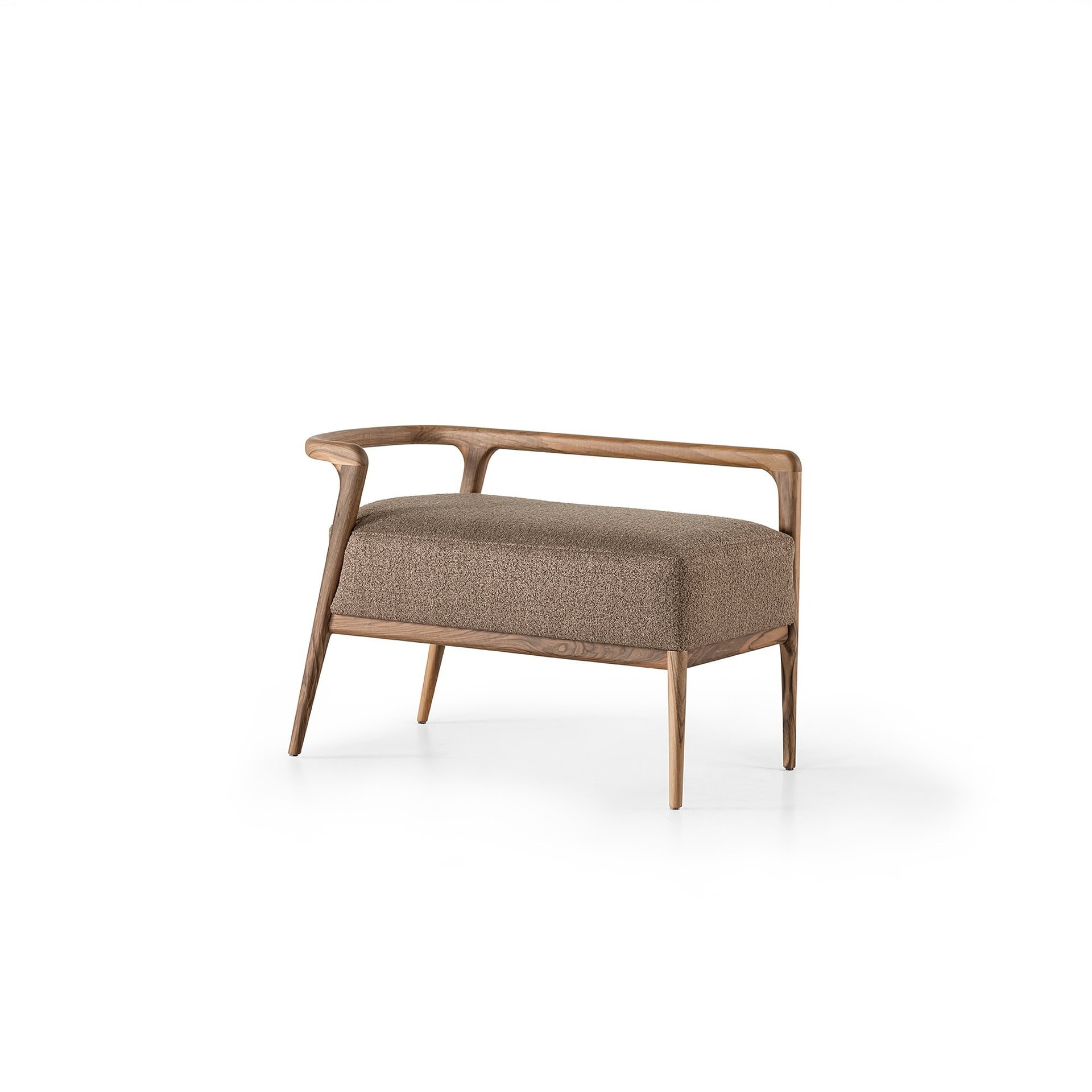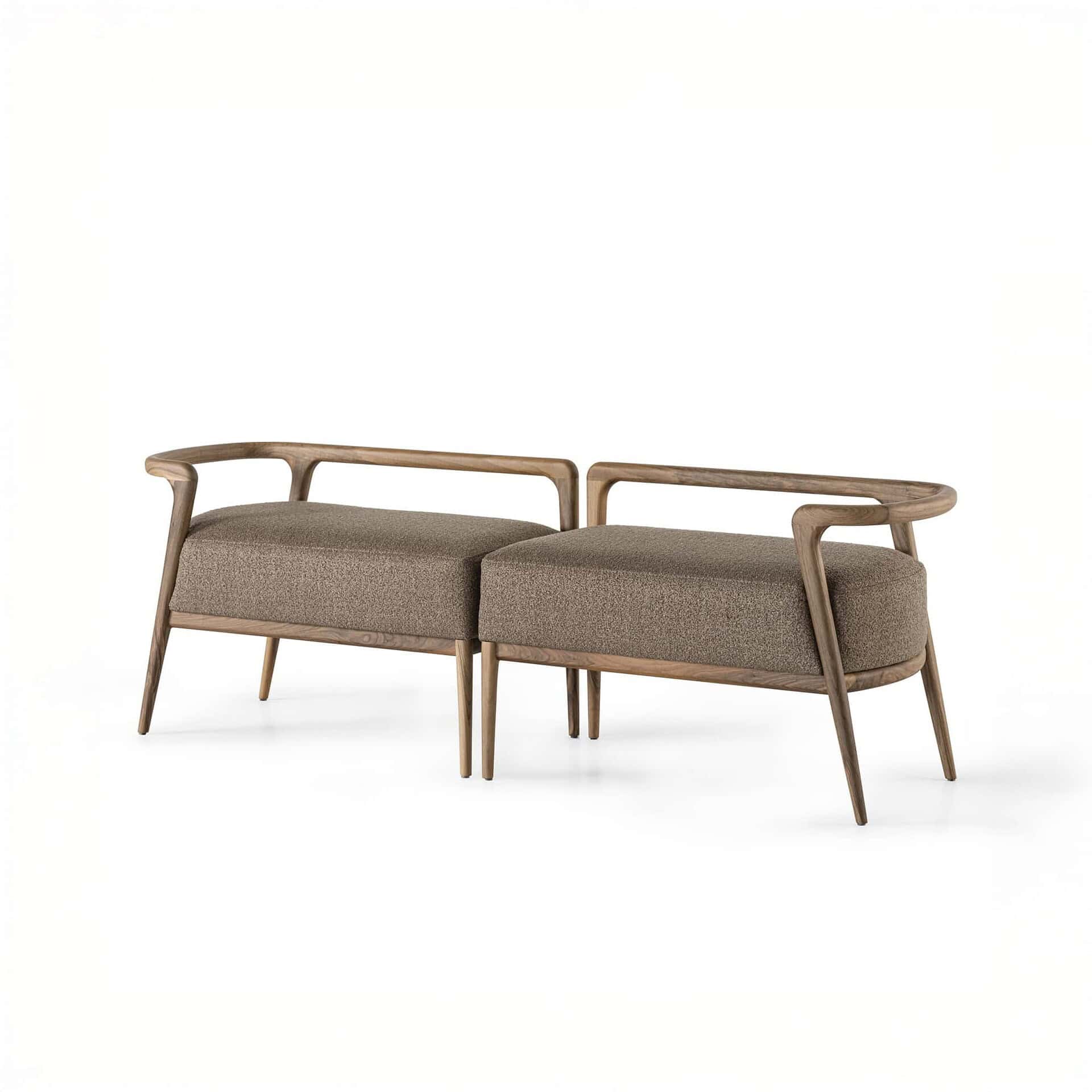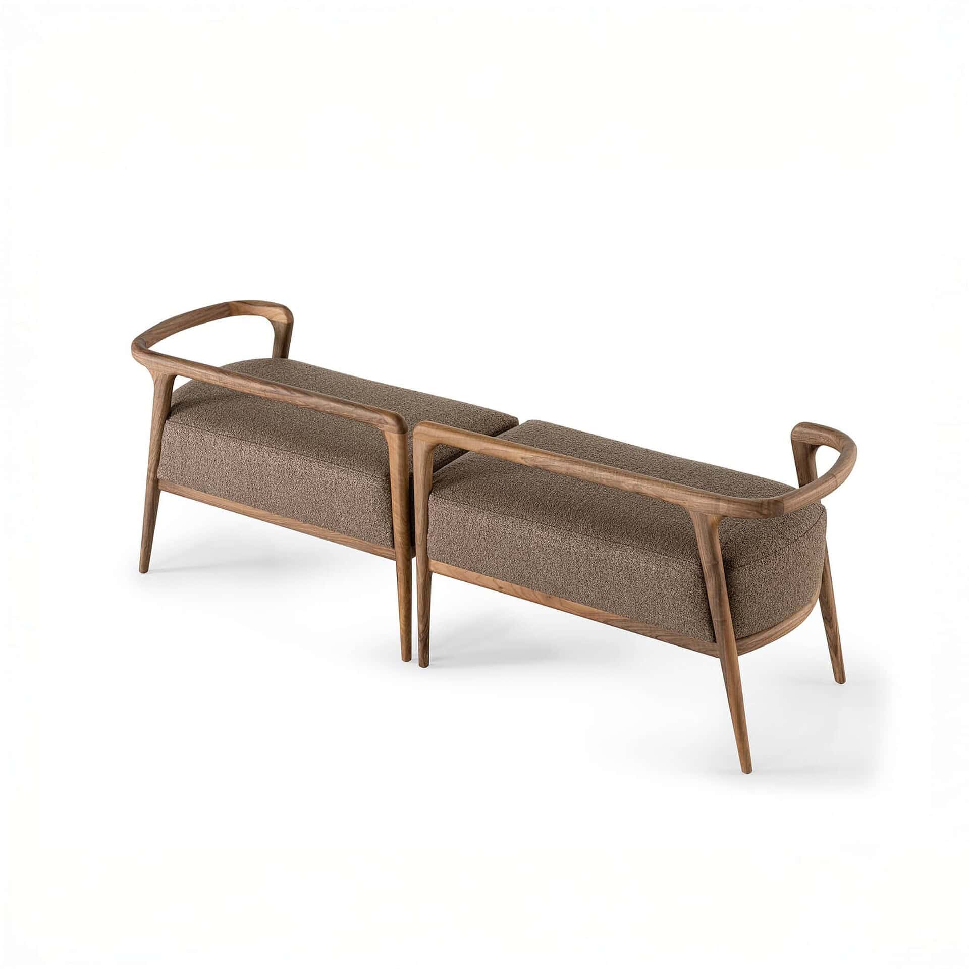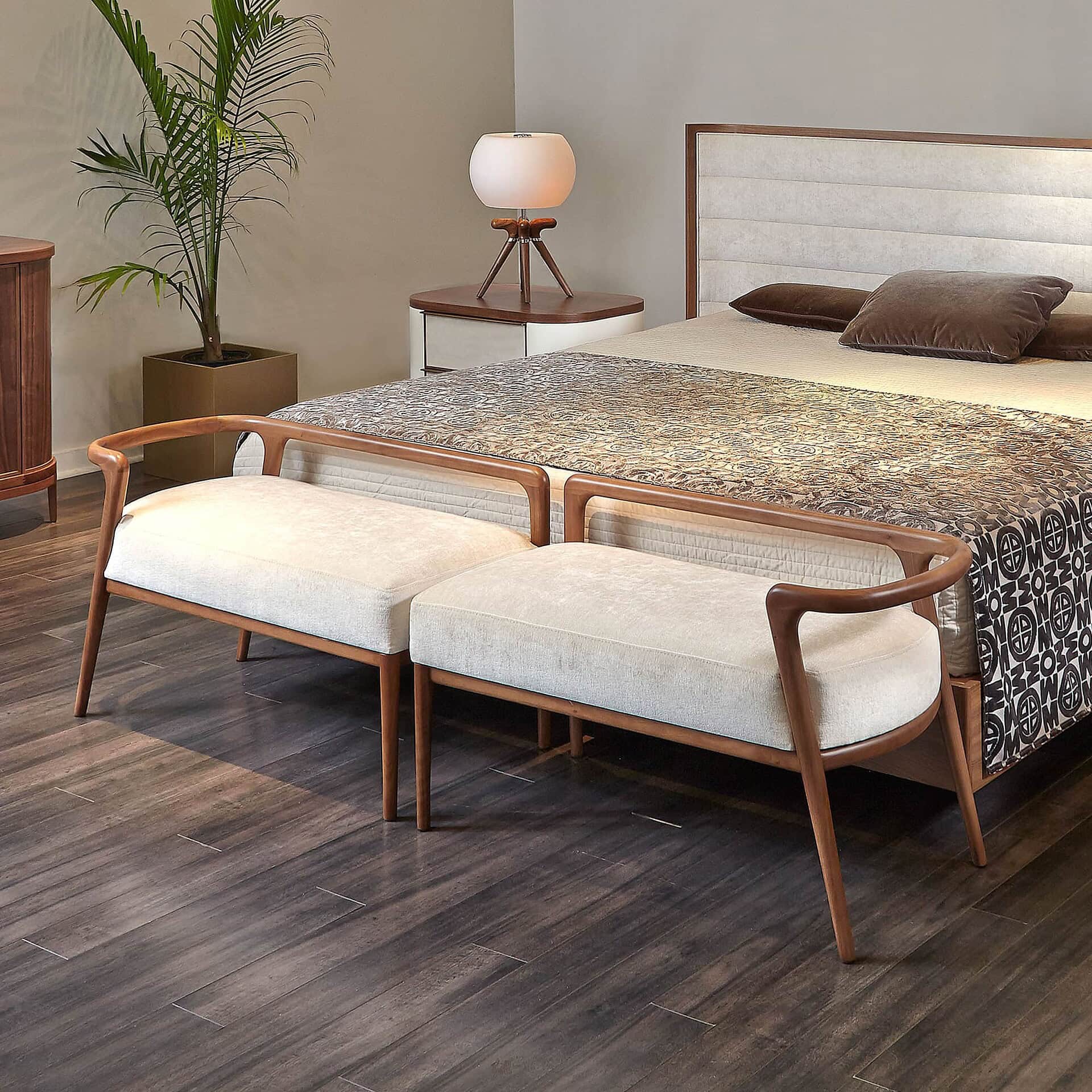 Constructed with a solid wood frame in walnut or oak, the Versus Bench features plush upholstered seating in your choice of fabric or leather. The exposed wood grain and curved detailing showcase refined joinery and thoughtful design. Whether used on its own or paired as a symmetrical set, the Versus Bench brings quiet elegance and functional beauty to modern interiors.