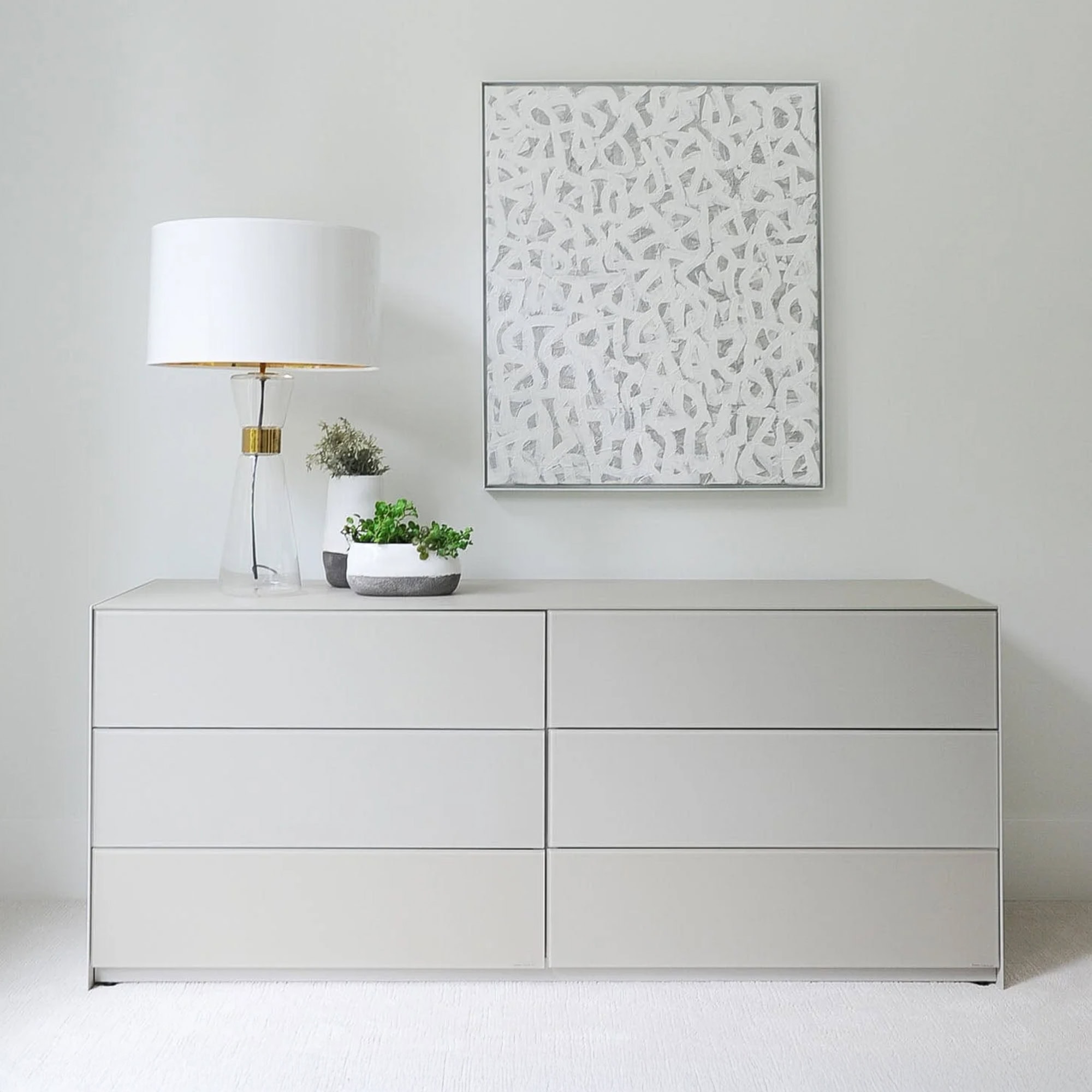 With its refined lines and customizable surfaces, the Absolute 6 Drawer Dresser offers a bold, architectural presence perfect for modern interiors. Its seamless, minimalist silhouette is brought to life through premium materials—featuring a fully welded steel frame and soft-close, push-to-open drawers clad in your choice of etched tempered glass, etched mirror, or porcelain fronts. The dresser’s low-profile stance, generous drawer space, and laser-cut pattern options (available for glass and mirror fronts) elevate both function and artistry, making it an understated yet striking statement piece in any bedroom or dressing space.