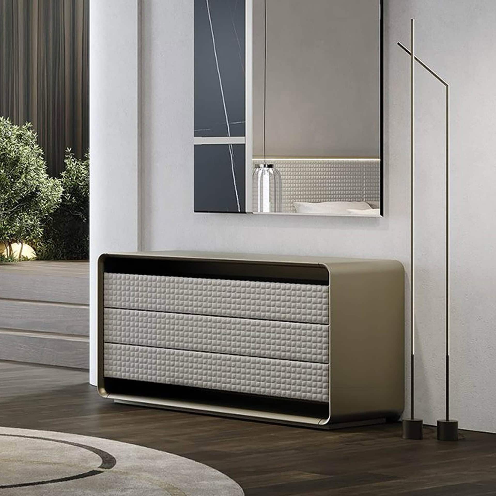 The Oh Comò Dresser by Reflex showcases refined Italian design in an elegant and contemporary silhouette. Designed by Tulczinsky, this three-drawer dresser highlights the contrast between clean structural lines and soft, quilted leather accents. Ideal for modern bedrooms seeking a blend of function and fashion, its balanced proportions and luxe materials bring a sense of sophistication and comfort to any interior setting.