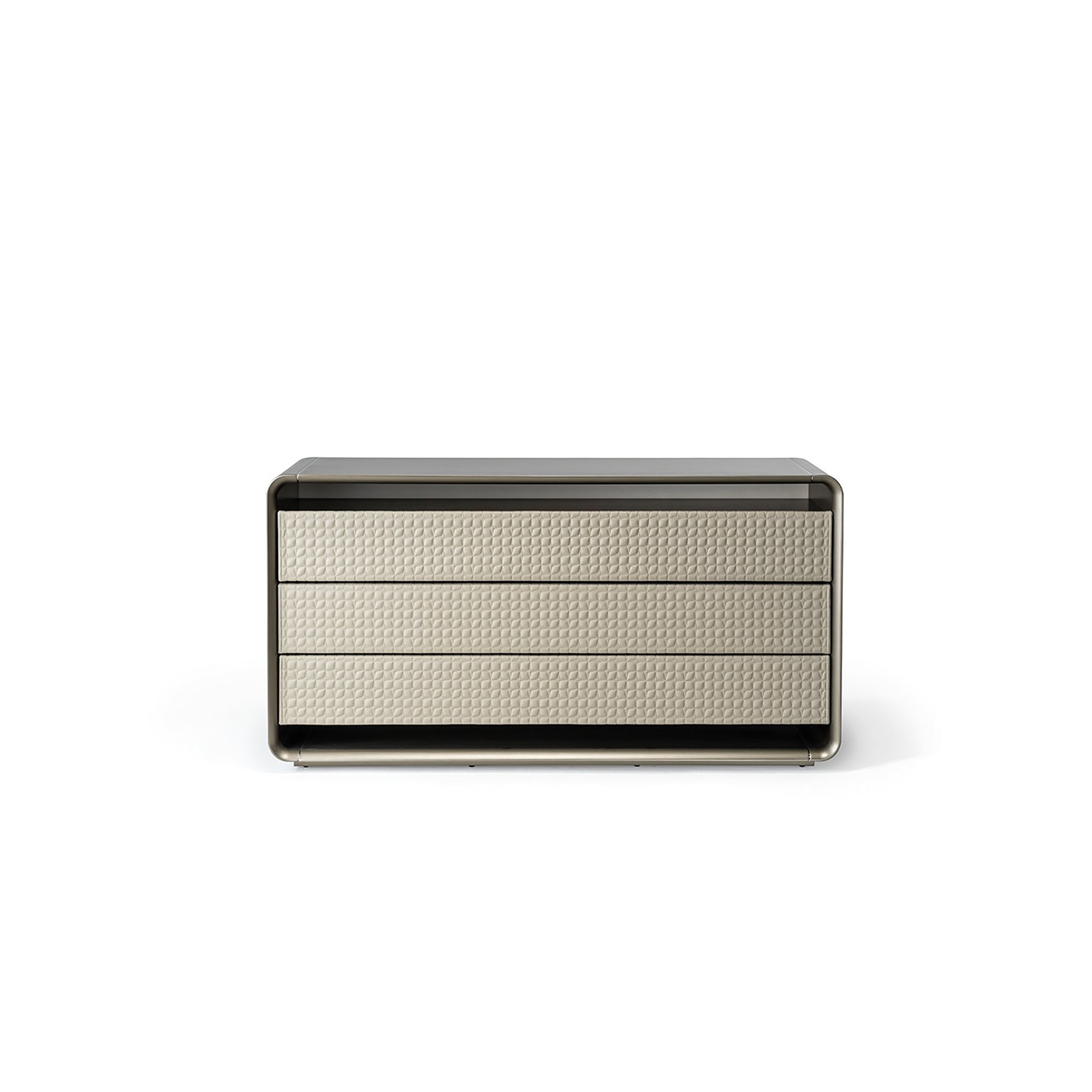 The dresser features a lacquered wood structure complemented by drawer fronts upholstered in quilted leather with a range of refined stitch patterns including Diamond, Emerald, San Marco, Fly, Exagon, and Millerighe. This combination of textures offers visual depth while maintaining a minimalist profile, making it suitable for diverse interior styles.