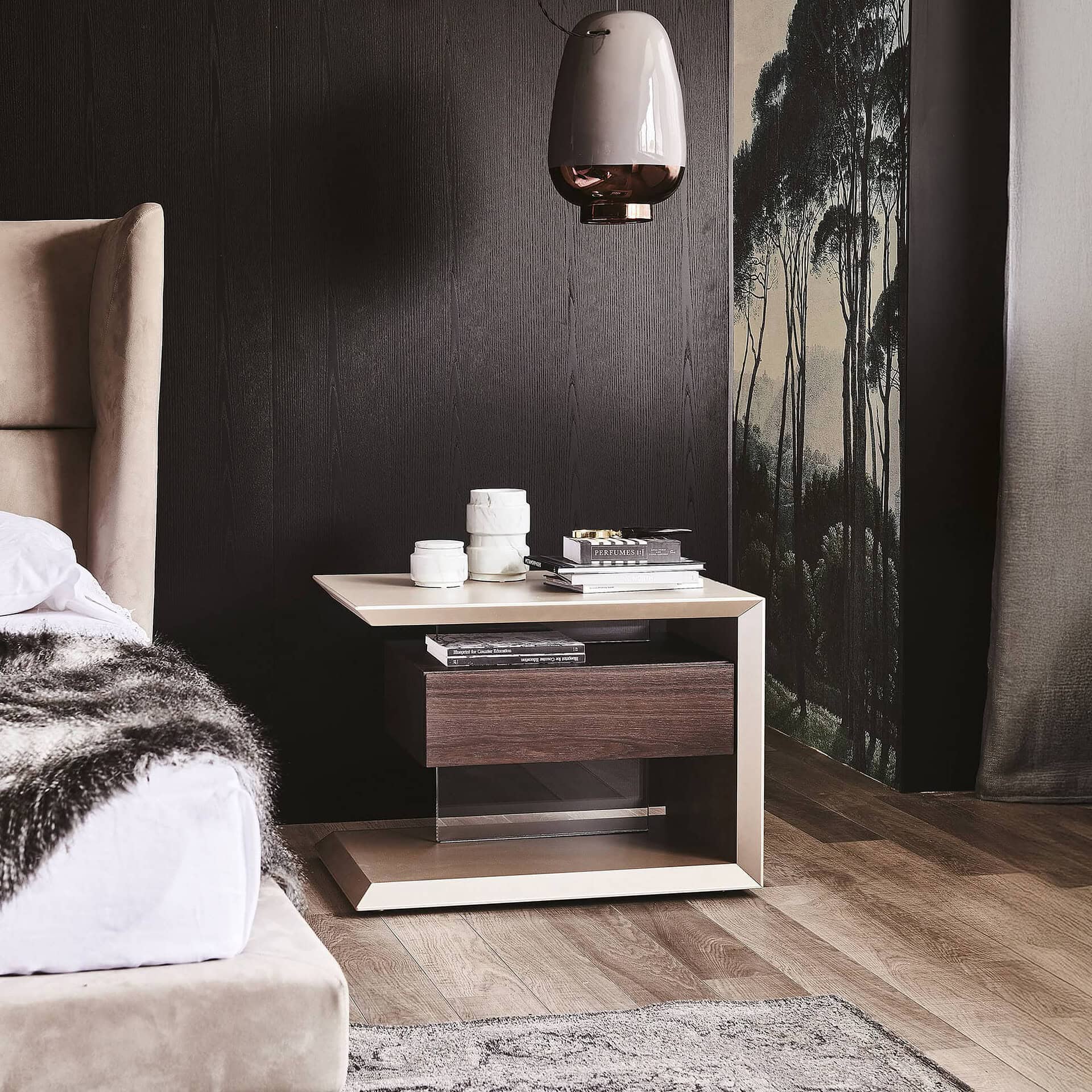 Designed with versatility in mind, the Biagio Modern Nightstand features a reversible configuration that allows it to be positioned on either side of the bed with ease. The architectural frame supports a single spacious drawer while an open lower shelf offers additional space for books or decorative objects. Crafted in Italy with exceptional attention to detail, the piece reflects a quiet elegance that complements both minimalist and layered bedroom settings.