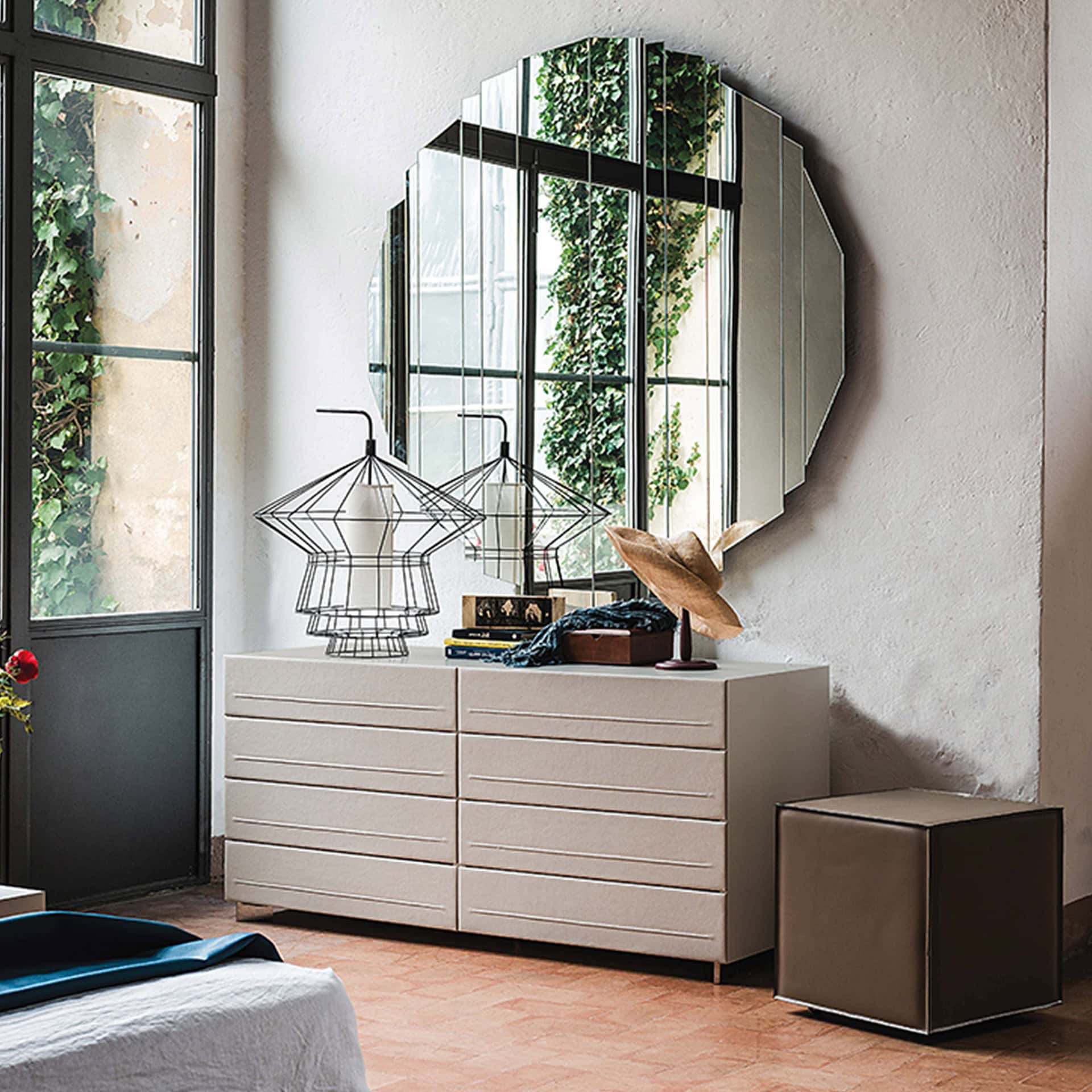 Wood frame in various finishes, stainless steel feet, eco-leather, or soft leather drawer fronts.