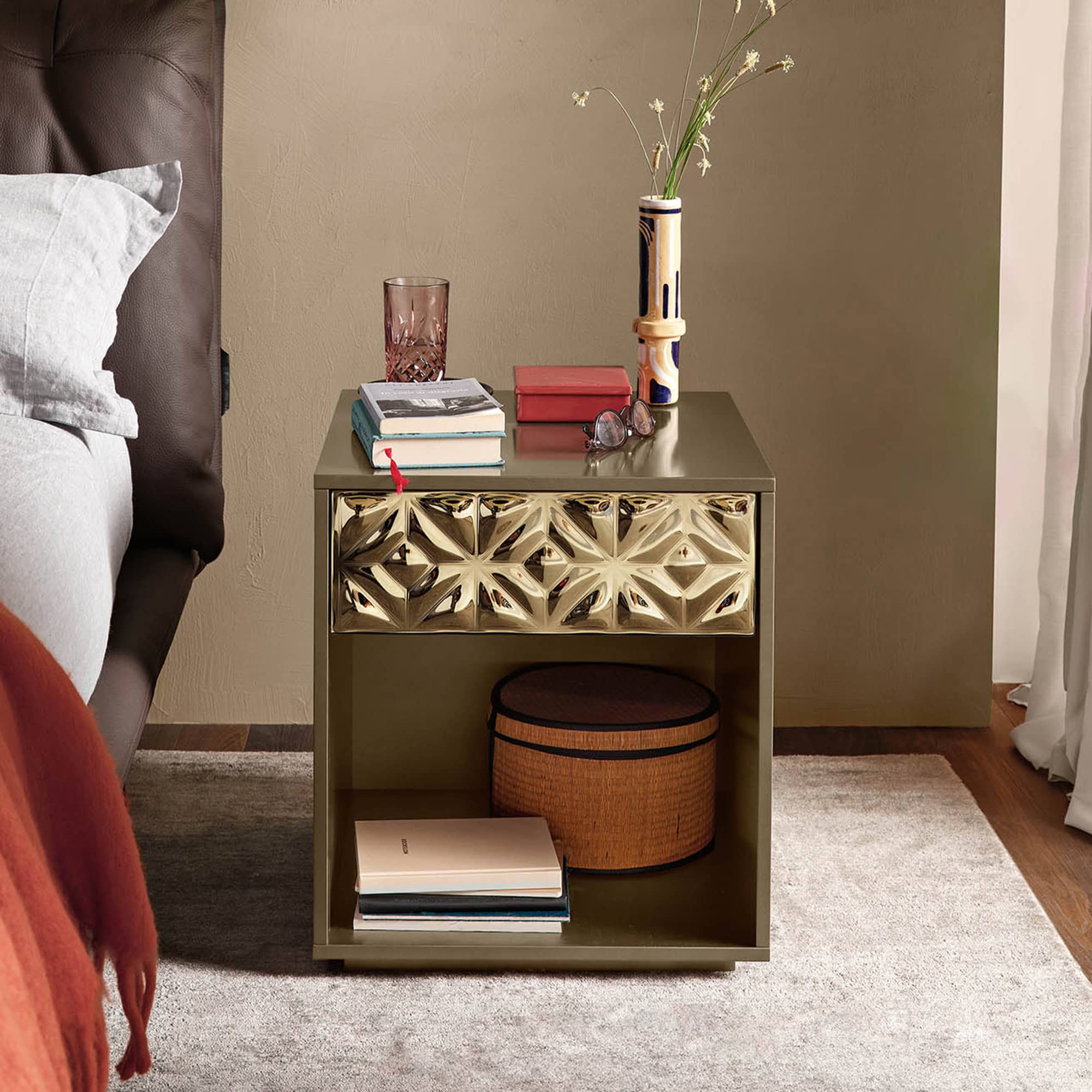 The Echo Nightstand by FIAM Italia, designed by Marcel Wanders, merges contemporary design with refined craftsmanship. Its sleek silhouette and understated elegance make it a perfect bedside companion for modern interiors. The standout feature is the fused glass drawer front, which adds a luminous, reflective quality that contrasts beautifully with the matte finish of the structure. Designed with functionality in mind, the nightstand includes a soft-close drawer and ample tabletop space for nighttime essentials.