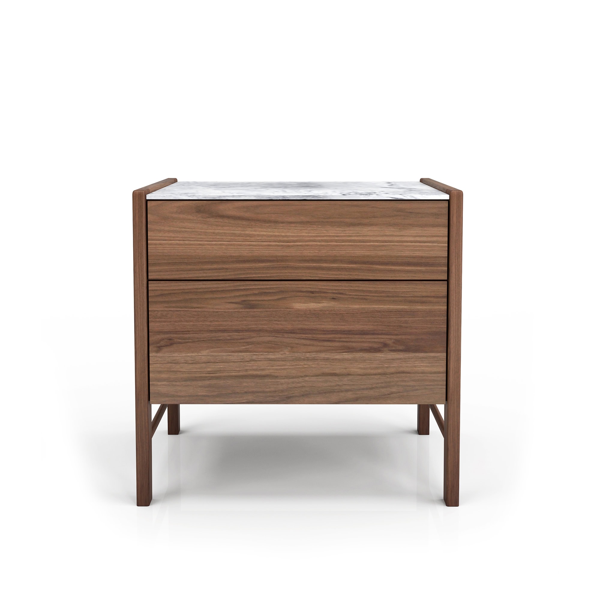 Crafted in either black walnut or white oak, the Frida Nightstand is available with your choice of a natural stone, acid-etched lacquered glass, or wood top. Each piece showcases unique grain patterns and natural color variations, ensuring no two nightstands are exactly alike. Over time, walnut options develop a warm caramel hue, adding depth and character to your space.