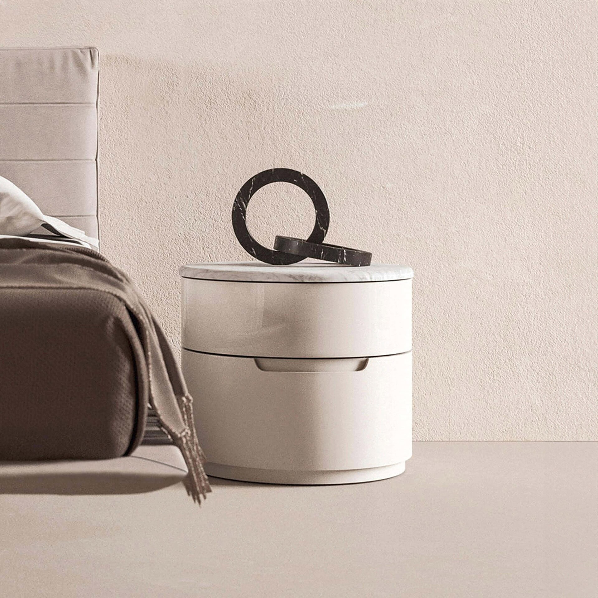[/vc_column_text][/vc_column][/vc_row]Crafted with premium materials, the Globo Nightstand features a finely finished wood or lacquered structure, available in a variety of contemporary colors. The optional marble top offers a selection of exquisite natural stone finishes, each with distinctive veining patterns. Soft-close drawer mechanisms ensure smooth and quiet operation, while the overall craftsmanship reflects Presotto’s dedication to quality and design excellence.