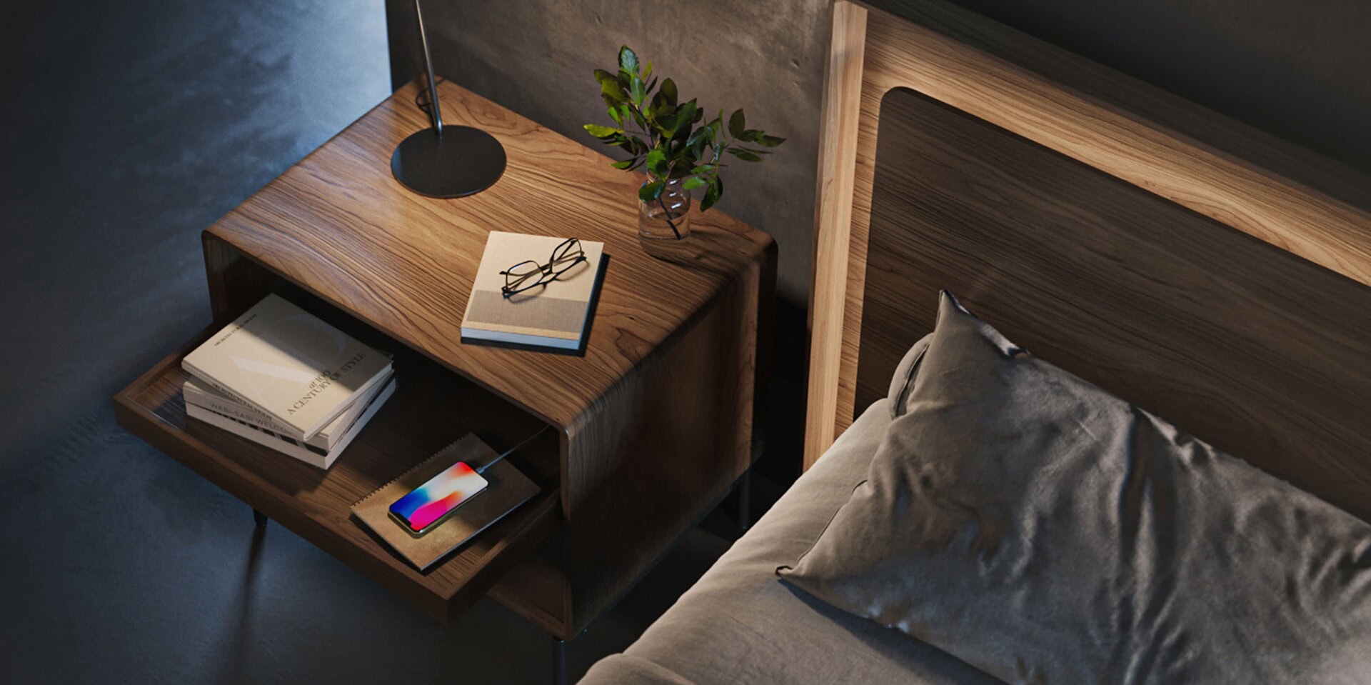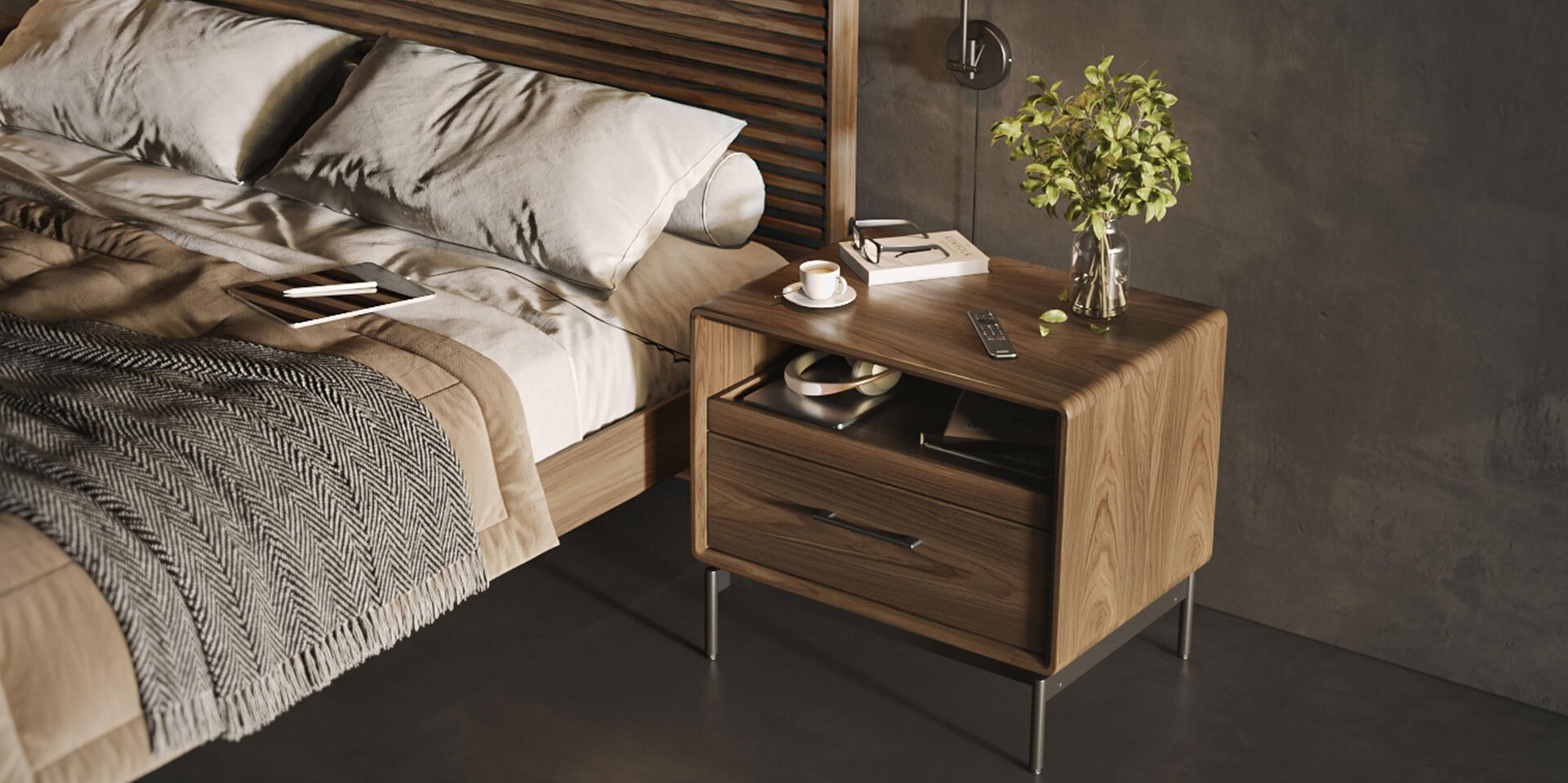 A modern bedroom scene featuring a floating gray nightstand with underlighting, a golden pendant lamp, and a bed with a textured headboard and patterned throw. Two ceramic vases and a book adorn the nightstand.