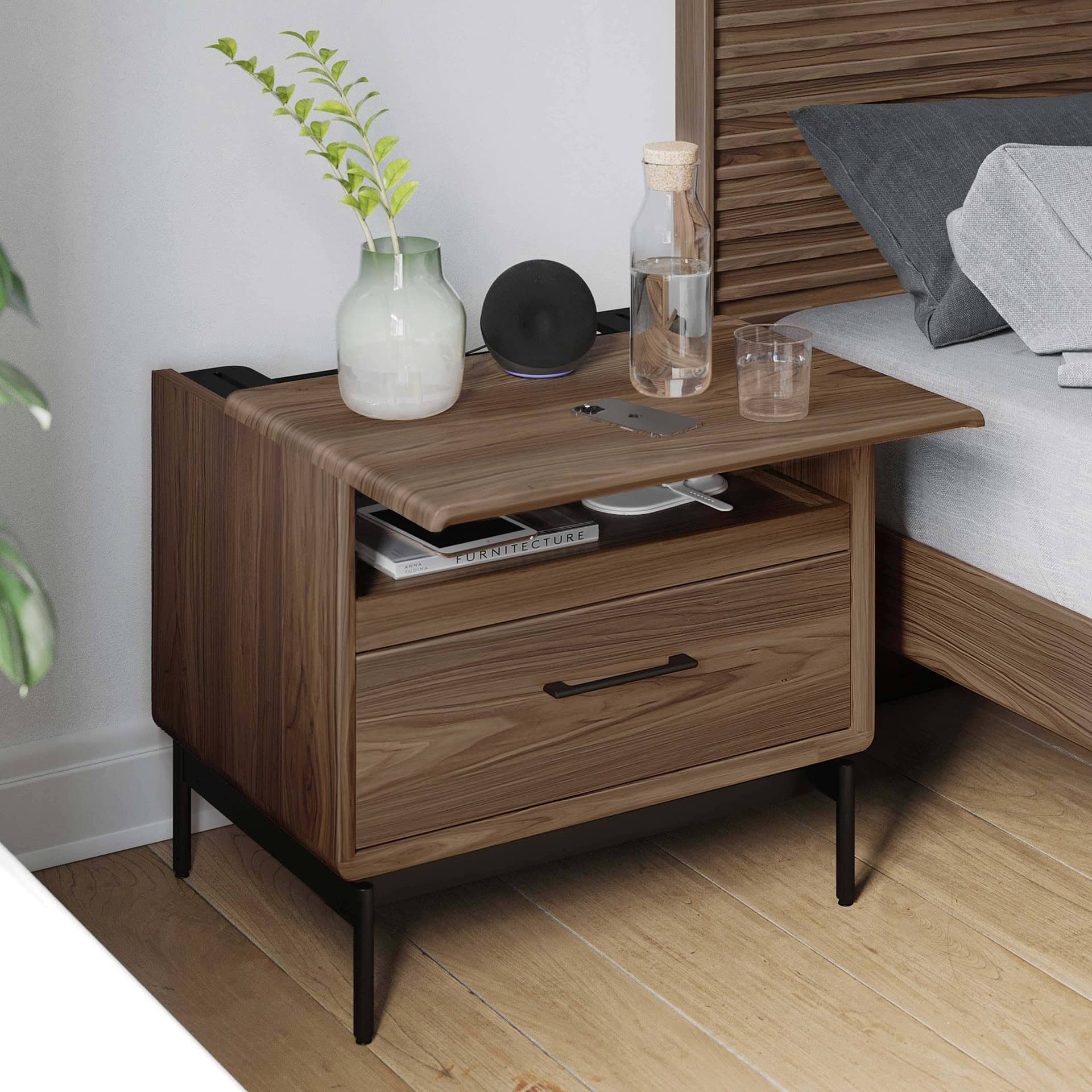 Contemporary nightstand with storage and decorative accents in a modern bedroom setting.