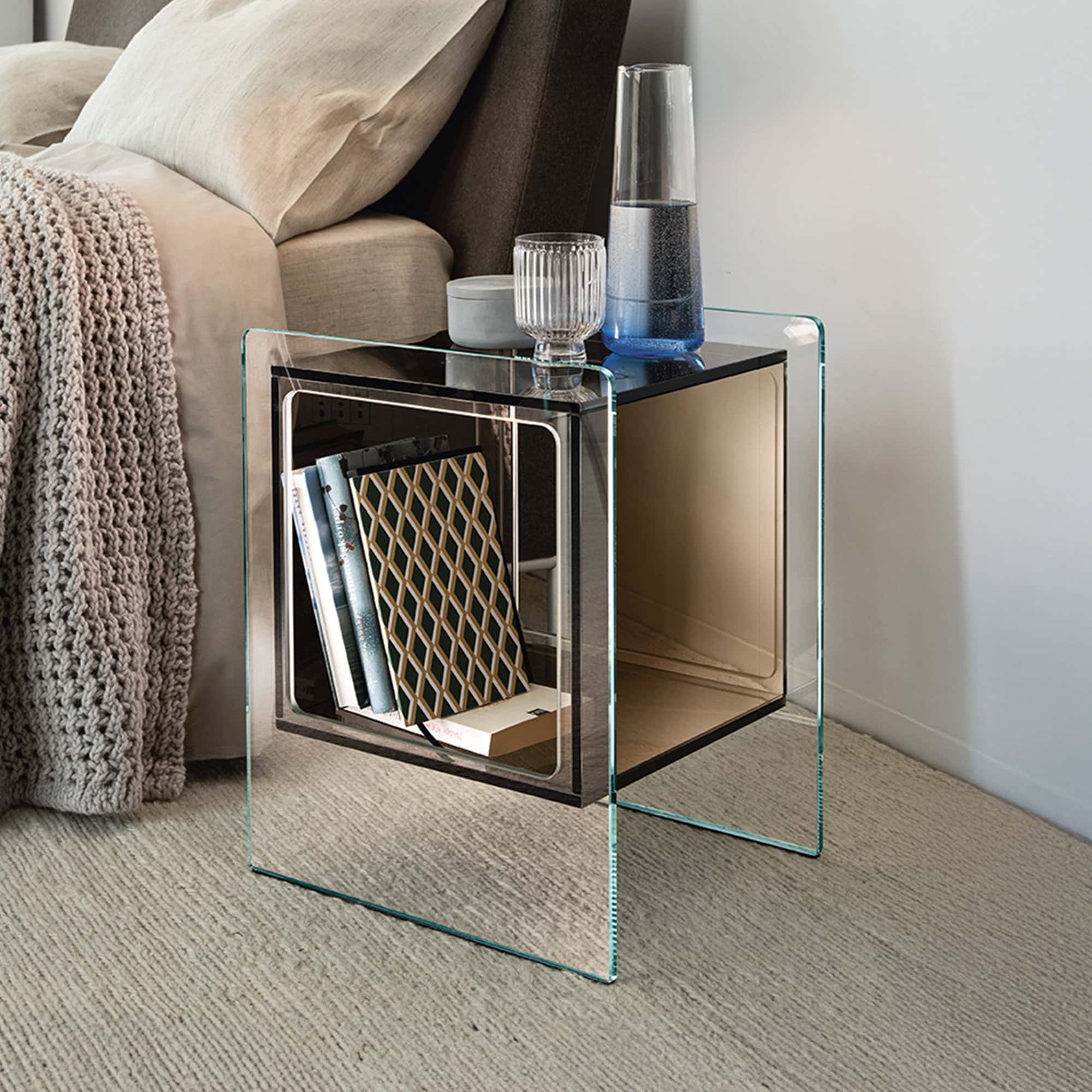 Sleek and sculptural, the Magique Nightstand by FIAM Italia redefines bedside functionality with a bold, minimalist approach. Designed by Studio Klass, this contemporary nightstand features a seamless 10 mm-thick welded glass structure that encases a cubed inner compartment—creating the illusion of a floating storage space. Its clean lines and transparent forms add an airy presence to the bedroom, making it ideal for modern and refined interiors. Whether styled alone or in pairs, the Magique Nightstand brings architectural clarity and functional grace to the bedside.