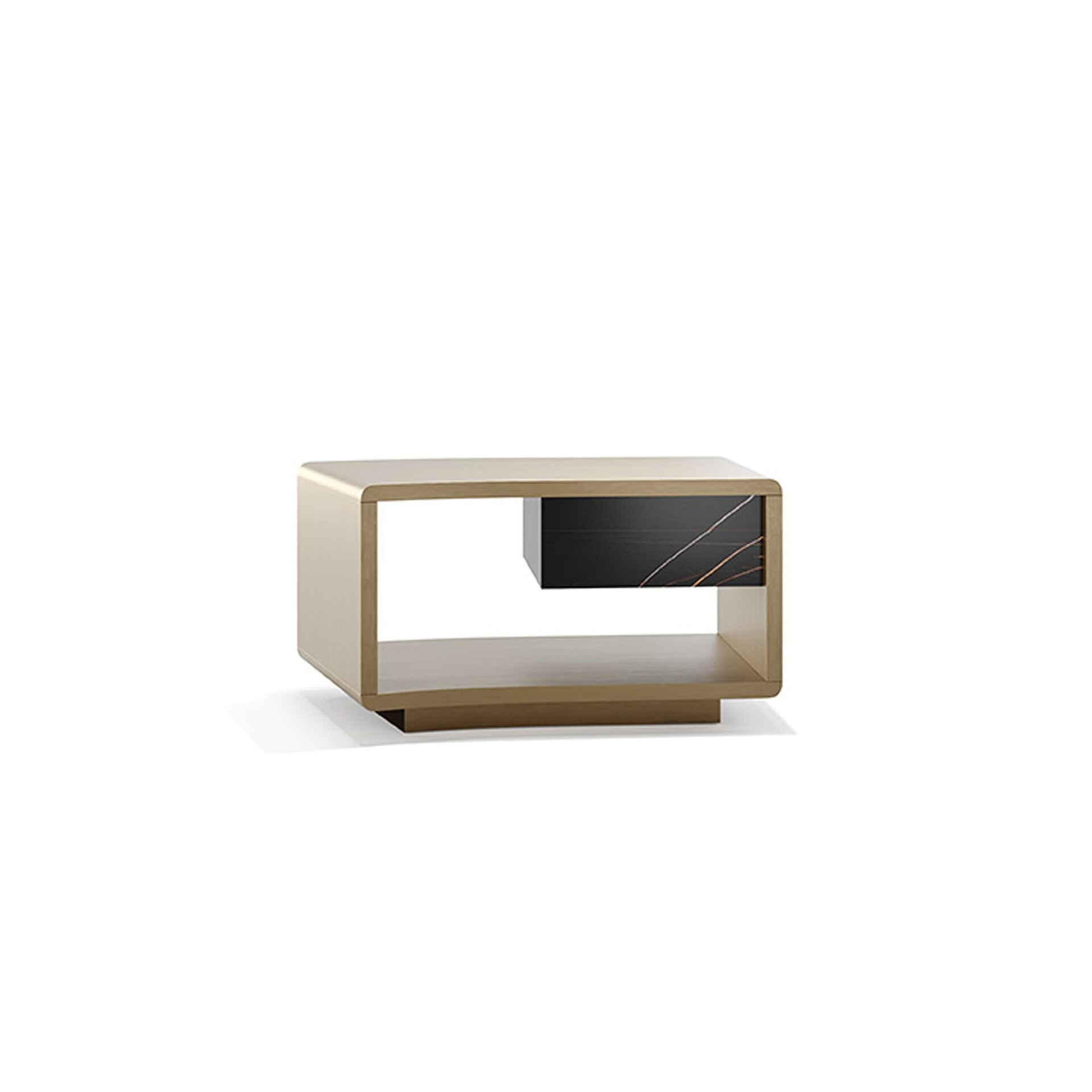 Structure in wood with optional finishes in marble-effect glass or wood-effect glass. Drawer in coordinating materials. Upholstery available in Satin Titanium (101M), Satin Brass (104M), Bronze (100M), or Satin Dark Brass (105M). Plinth available in wood or metal finishes. Smoked glass shelf included.