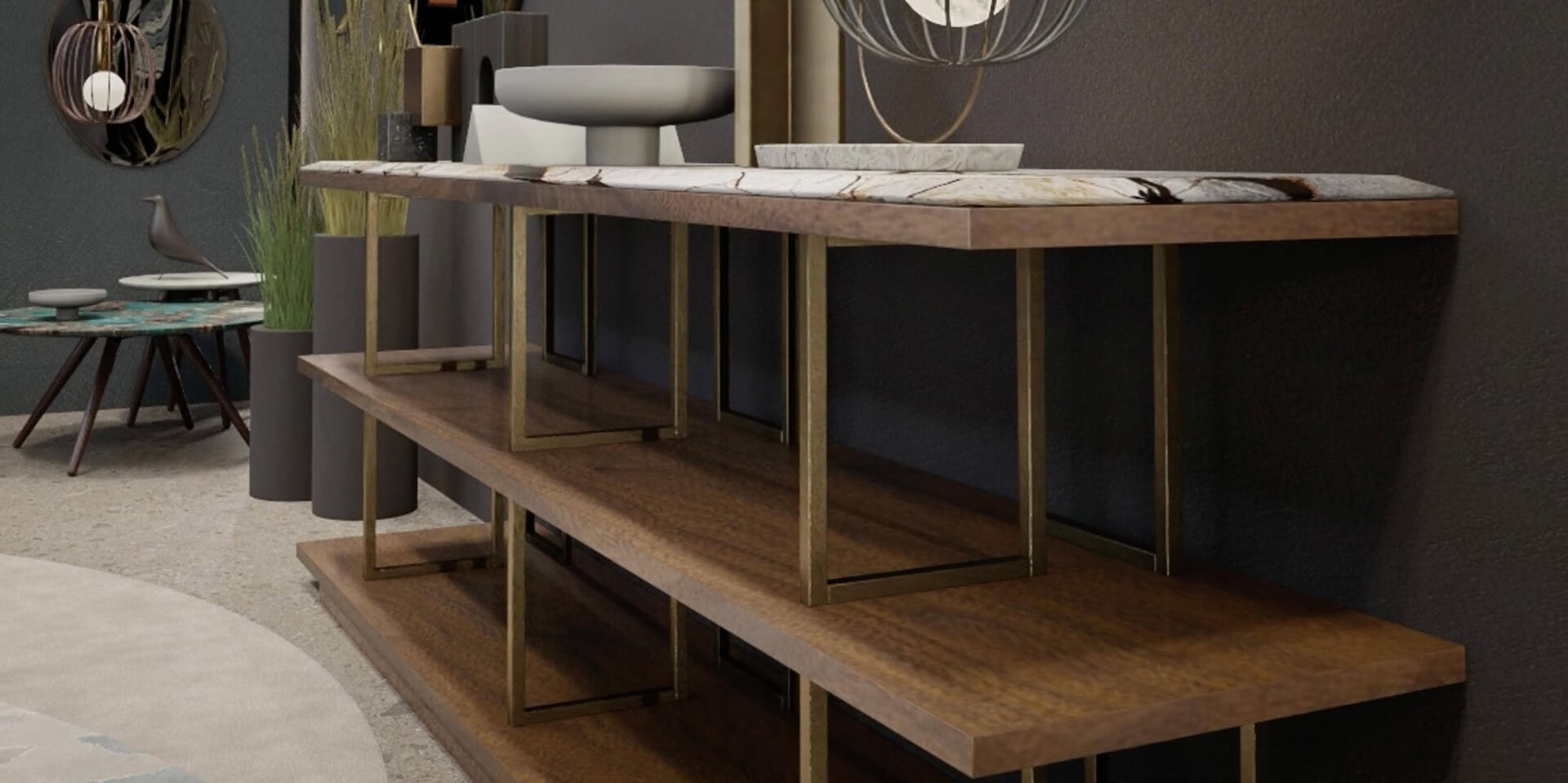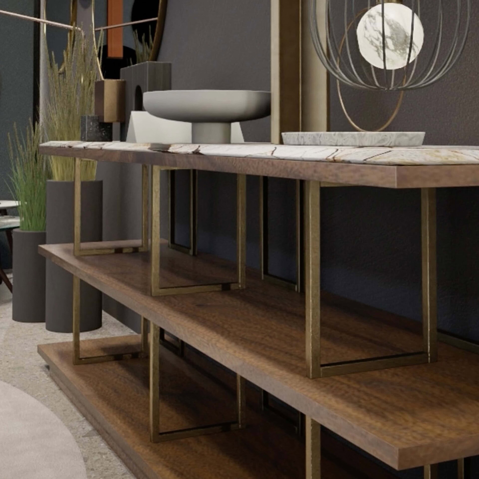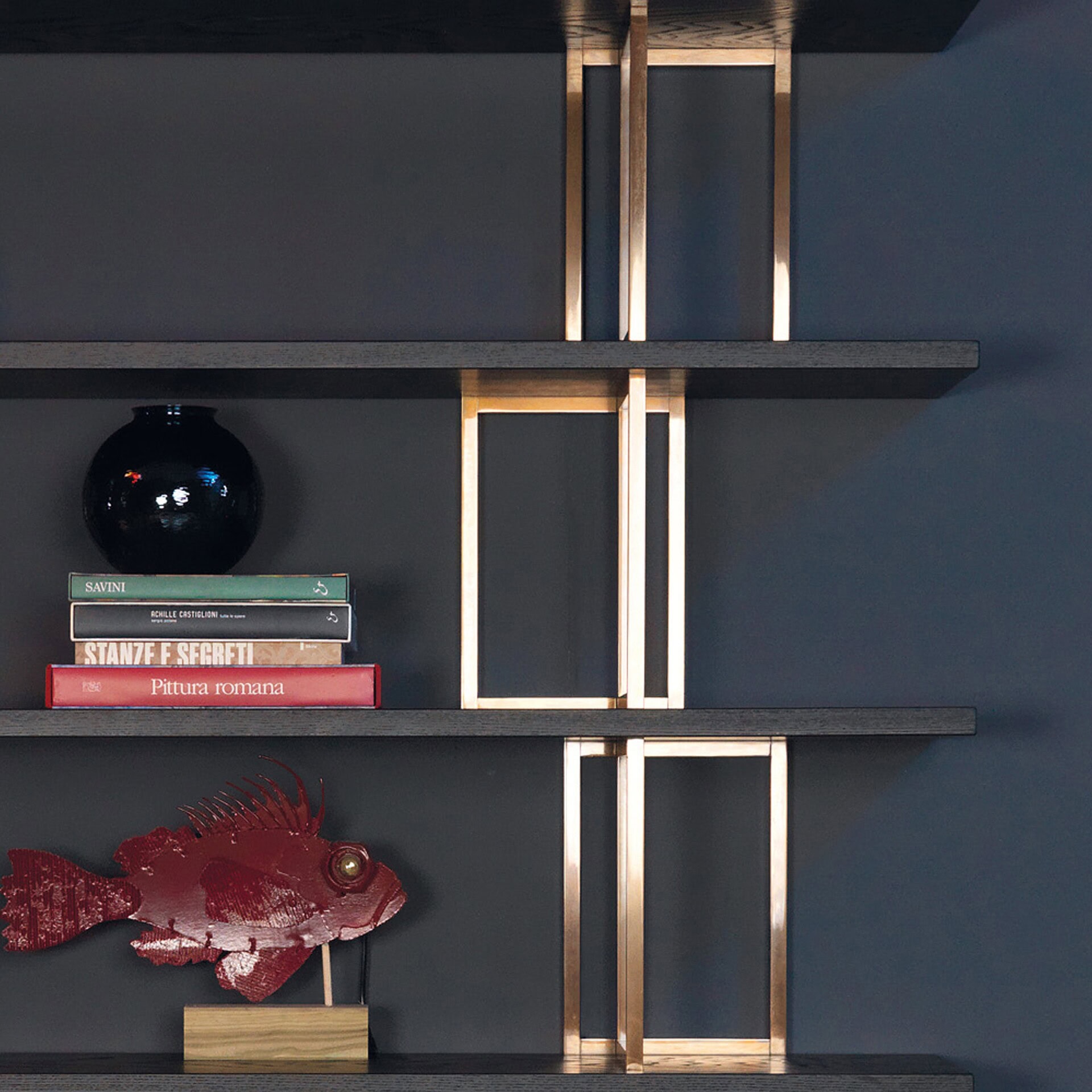 The Kris Buffet is a modular system of wooden shelves veneered in lacquered oak or Canaletto walnut, with satin brass or burnished bronze effect uprights.