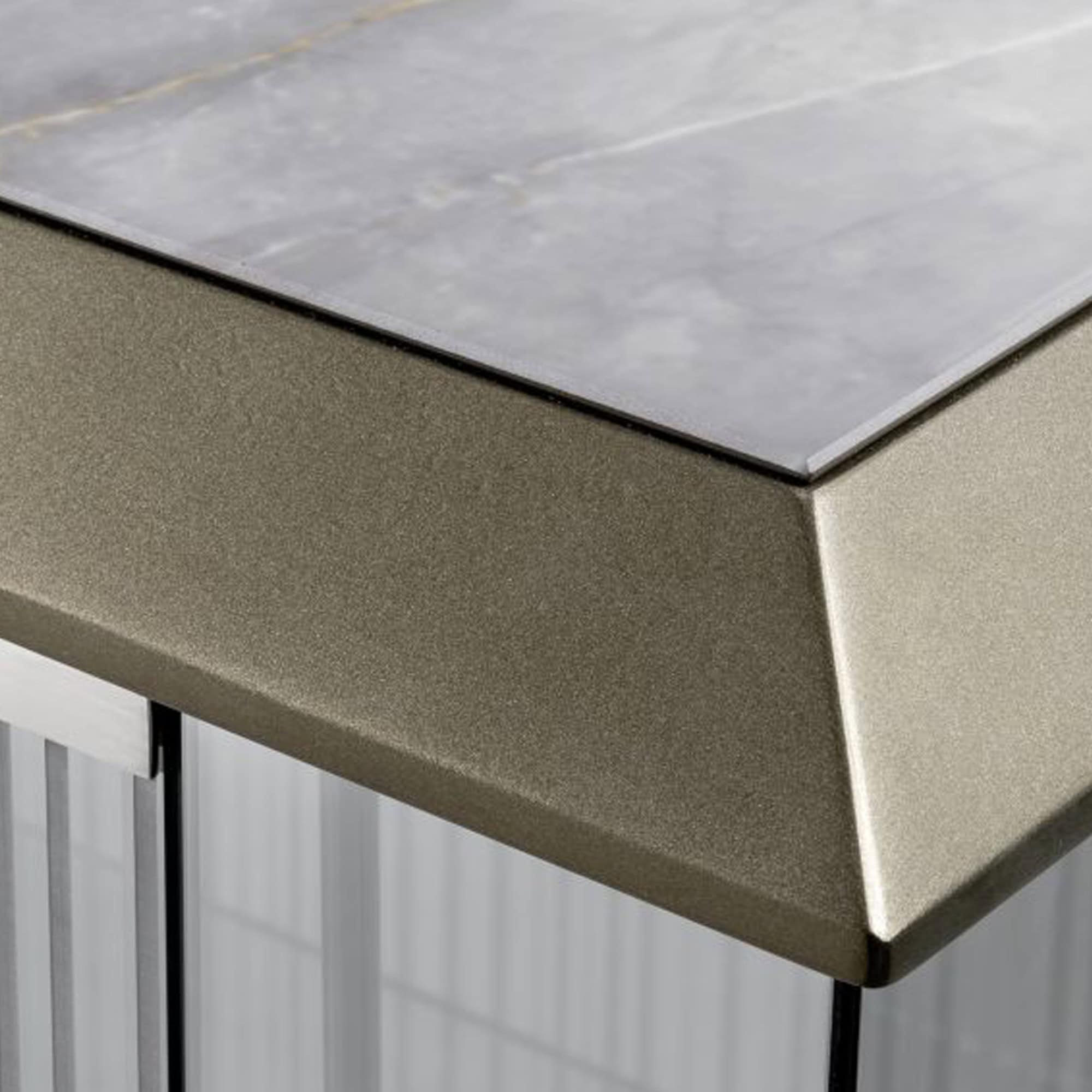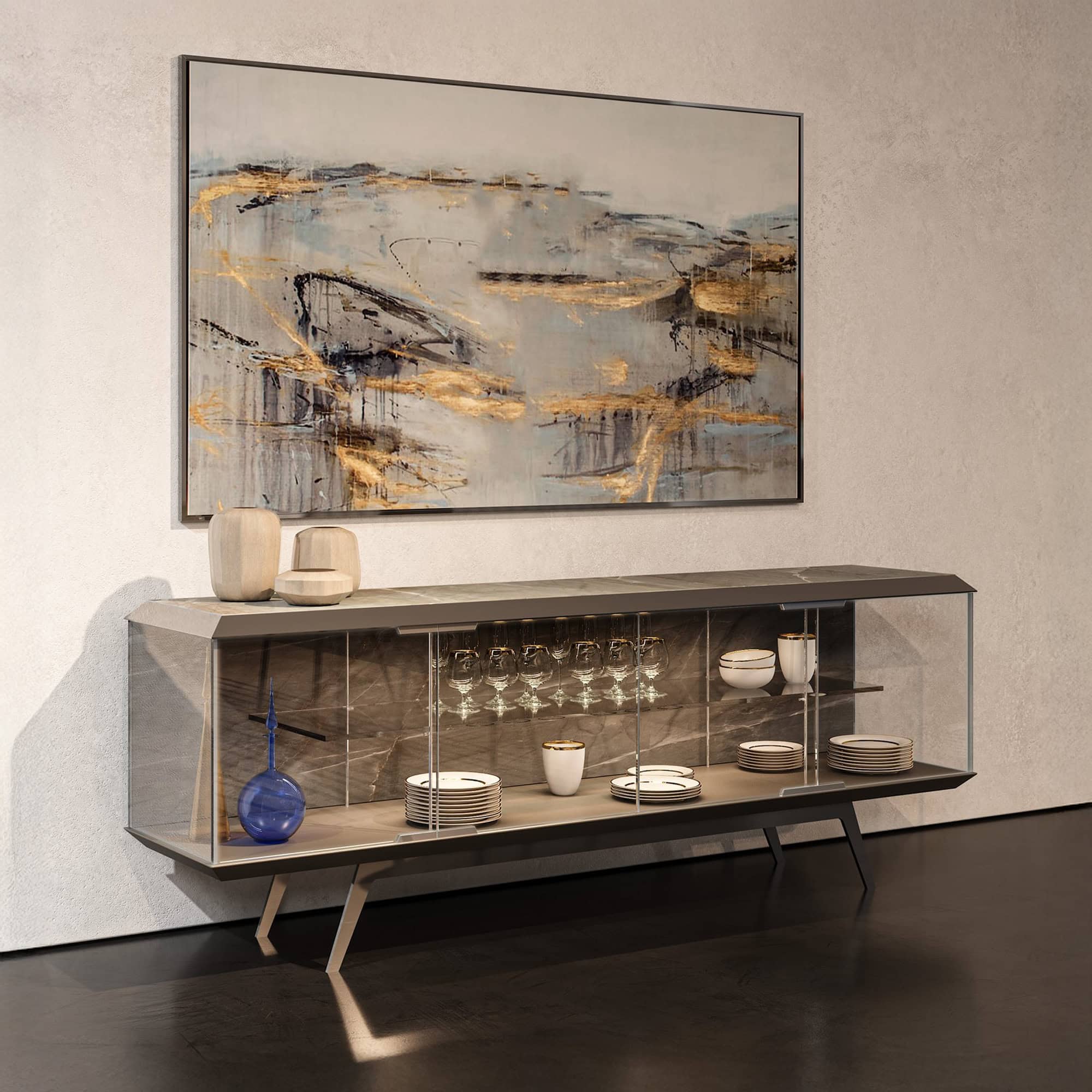 The London Glass Buffet Cabinet blends contemporary Italian craftsmanship with timeless elegance, offering a refined storage solution for modern dining spaces. Its sleek glass structure, accented with premium finishes and optional Marmoreflex® marble glass, creates a striking focal point that is as functional as it is artistic. Designed by Emanuele Missaglia, this buffet elevates both formal and casual interiors with its sophisticated balance of transparency, texture, and light.