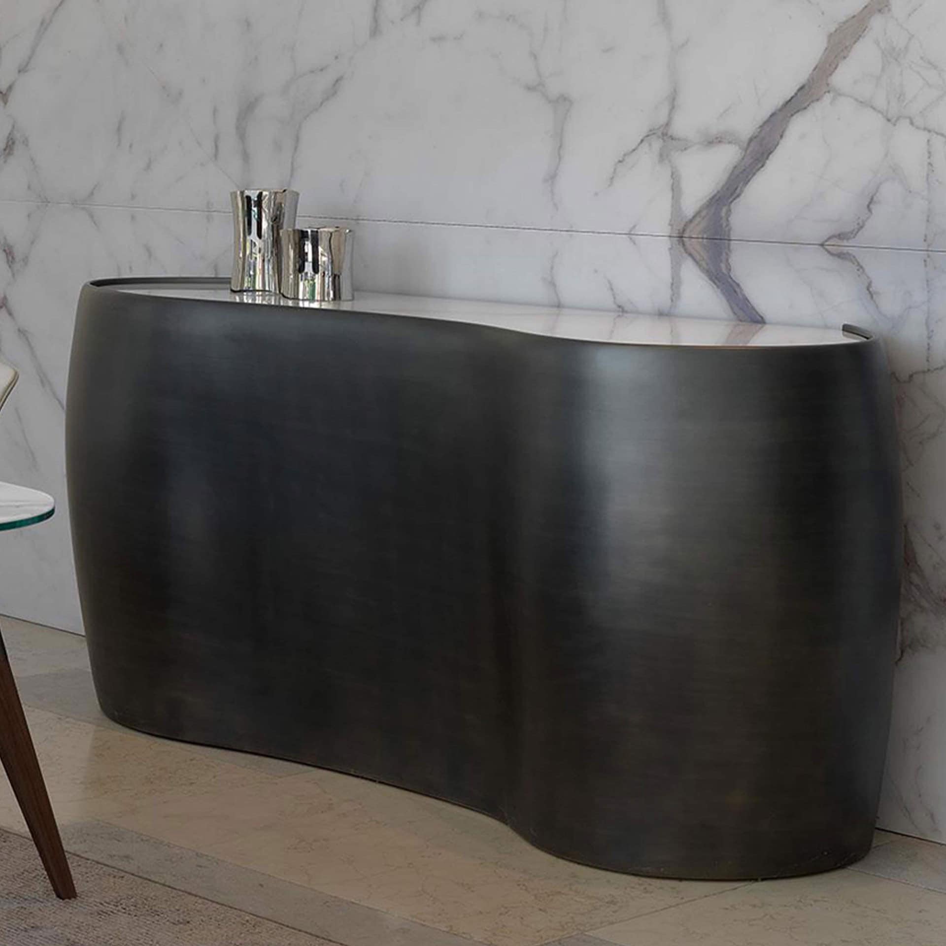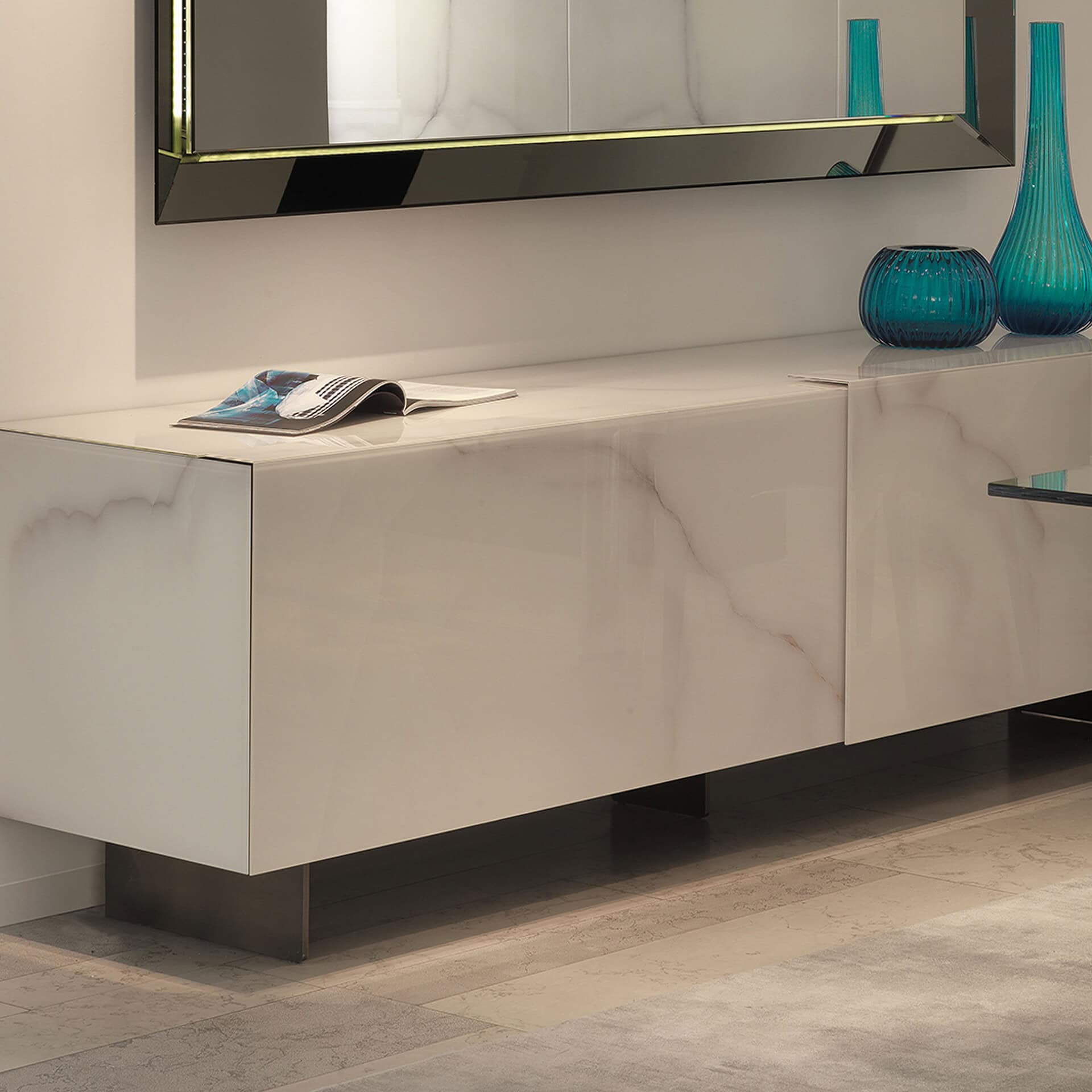 Designed by Riccardo Lucatello, this bar cabinet has a striking shape. Finished in matt lacquer or satin brass or titanium. The best choice is lacquered glass or marble glass. The internal storage unit of this bar unit comes with glass shelves and bottle holders and is operated by an electrical lifting system with a remote control. Metal footrests are optional.