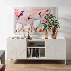 The classic Solar Buffet is the perfect addition to any dining room. It has a wooden frame and doors that are lacquered and decorated for a unique and beautiful look. The open spaces, side panels, and hinged doors provide plenty of storage for any occasion. The top is available in a variety of options, while the base and frame feature feet in lacquered metal.