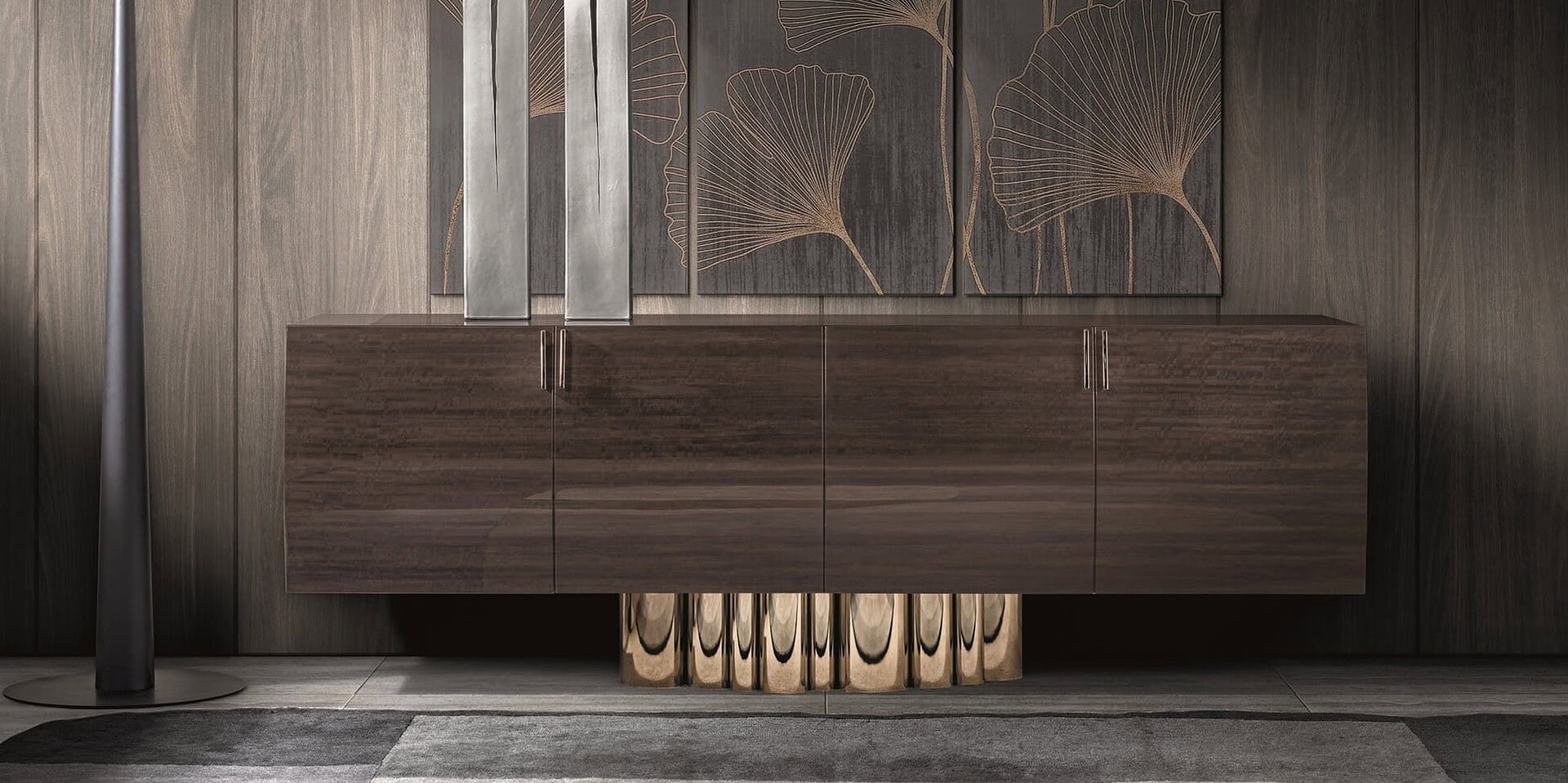 There is a celebration of modern style in the composition of metal tubes with varying diameters. A precious central base rests at the center of the 3-door buffet, allowing it to rest on the entire volume. As a result, the buffet appears to float, and is enhanced by the elegant curved silhouette of its design, giving the impression that it is floating. There is also a table version of Splendor available for purchase.