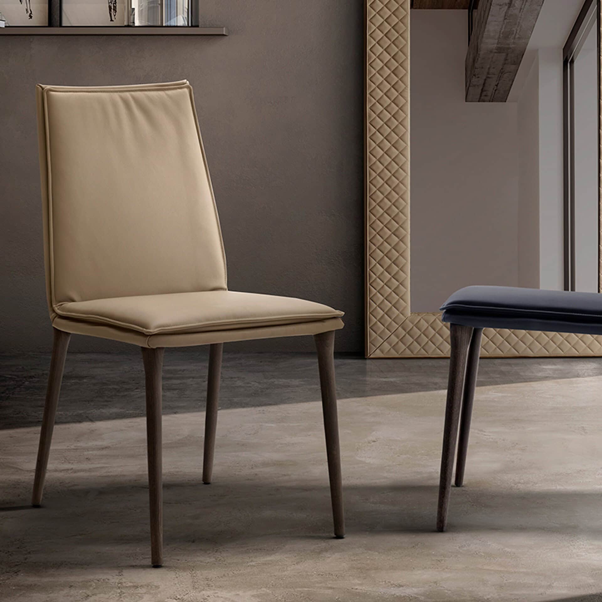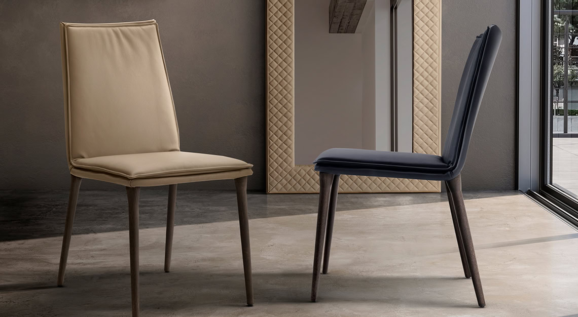 The Alexia is a refined upholstered chair with elegant wooden legs and an integrated cushion that provides great comfort. It is available in two heights and in leather, eco-leather or fabric. Covers cannot be removed.