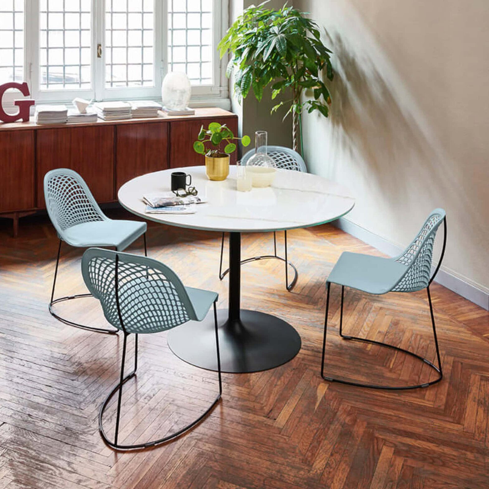 The Guapa Side Chair, designed by Beatriz Sempere and Franco Poli in 2014, masterfully fuses sculptural elegance with refined comfort. Its distinctive sled base and open, airy silhouette offer a sense of lightness, while the seamless transition from the lacquered metal frame to the luxuriously hand-cut hide seat and backrest creates a harmonious interplay of structure and softness. With its contemporary lines and artisanal details, the Guapa is equally at home in refined dining spaces, creative offices, or lounge areas where design is celebrated.