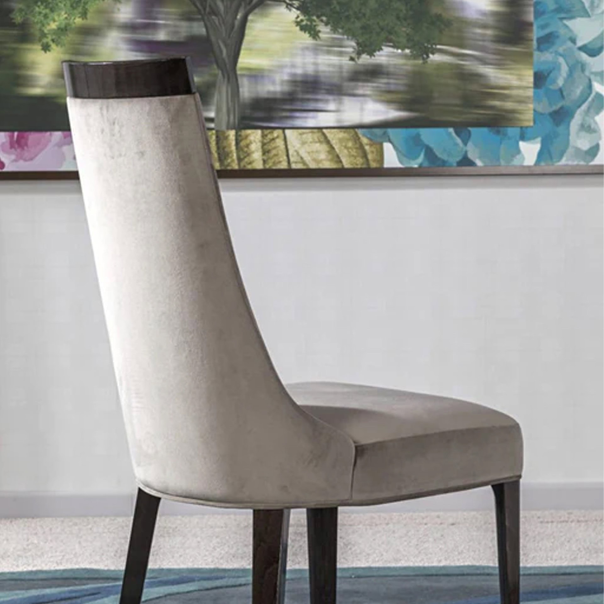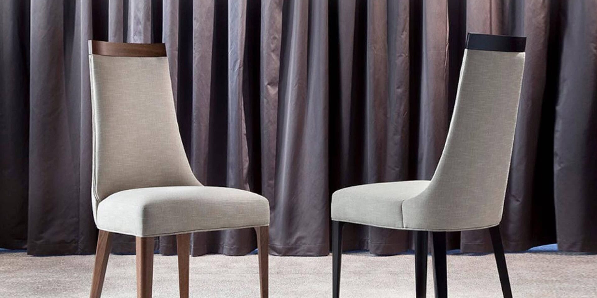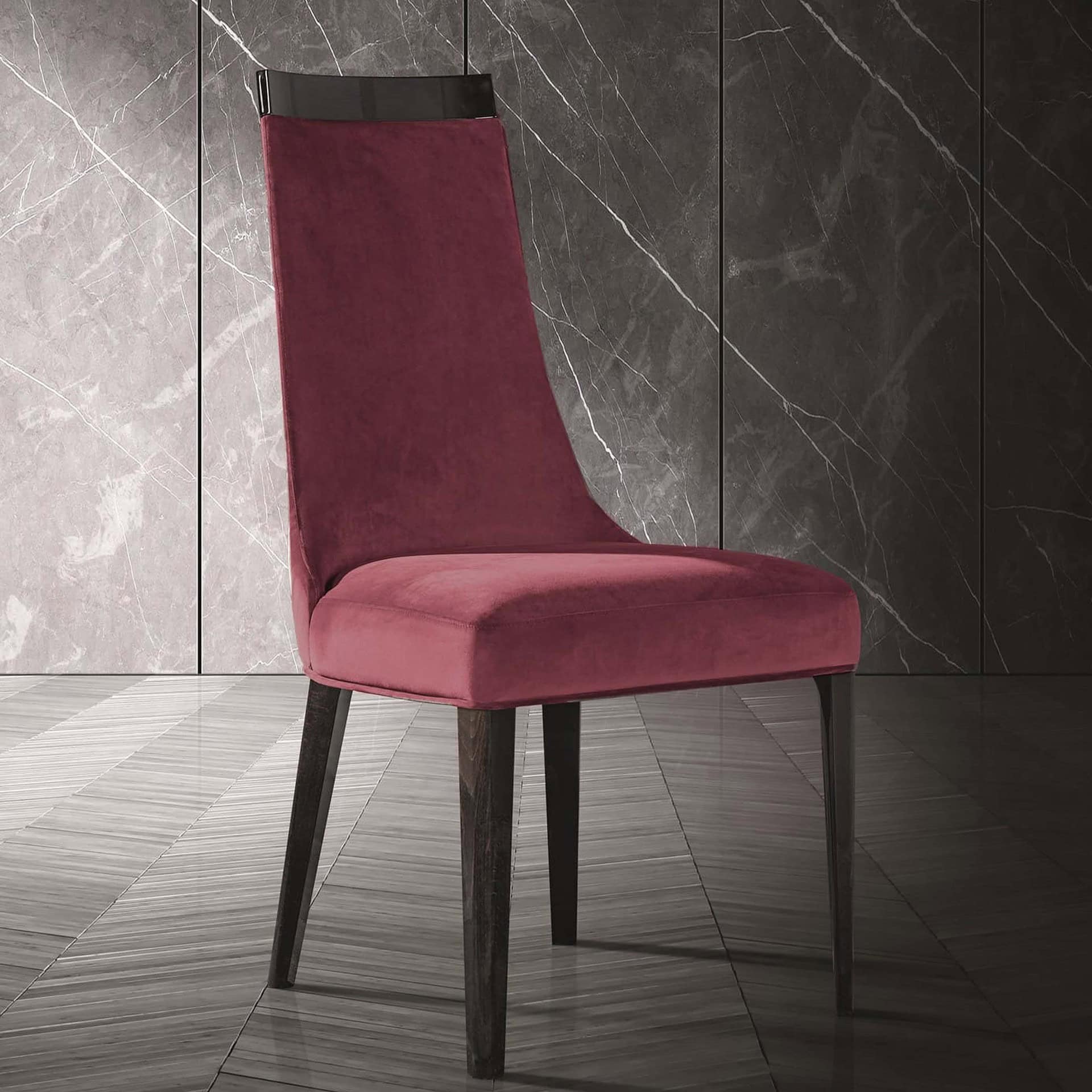The Scanone Chair is an elegant dining chair with soft curves that are covered in fabric upholstery. The backrest, with its curvilinear silhouette, is topped by a wood trim, adding the final decorative touch.