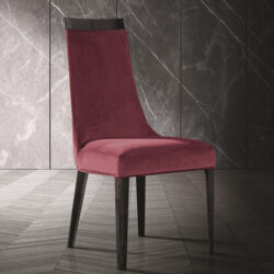 The Scanone Chair is an elegant dining chair with soft curves that are covered in fabric upholstery. The backrest, with its curvilinear silhouette, is topped by a wood trim, adding the final decorative touch.