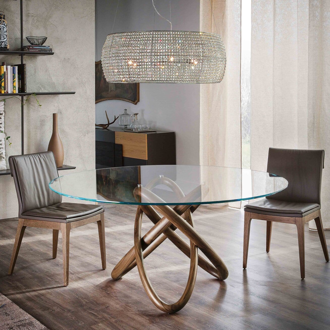 Furniture like the Carioca glass table is sophisticated and original. This modern table has a sculptured base with three wooden rings, as well as a refined glass top, which will add a sophisticated touch to your home. In addition to being available as a rectangular glass table, Carioca is also available as a modern round table in different sizes. Italian craftsmanship and materials, along with an attention to detail that is typical of Italian manufacturing, add to the wonder of this table.