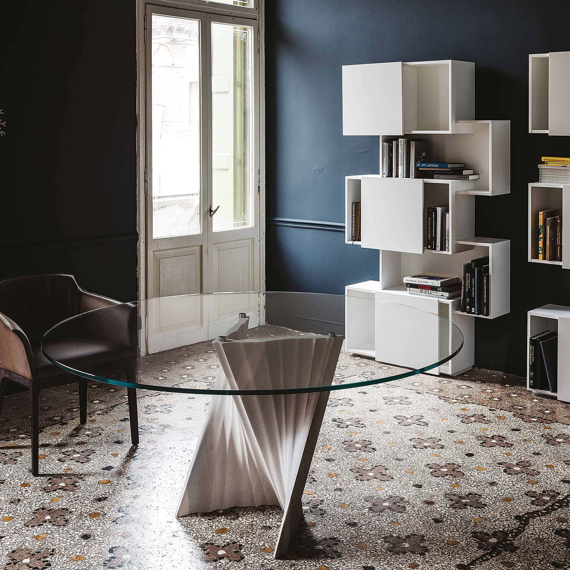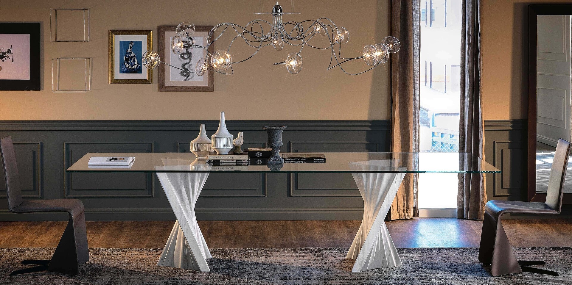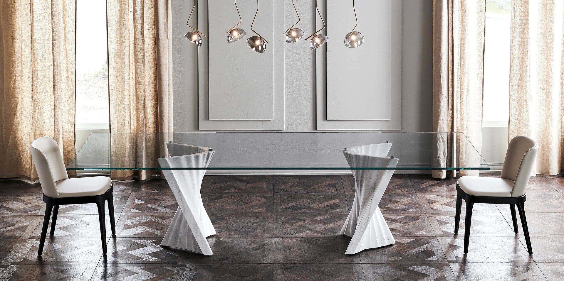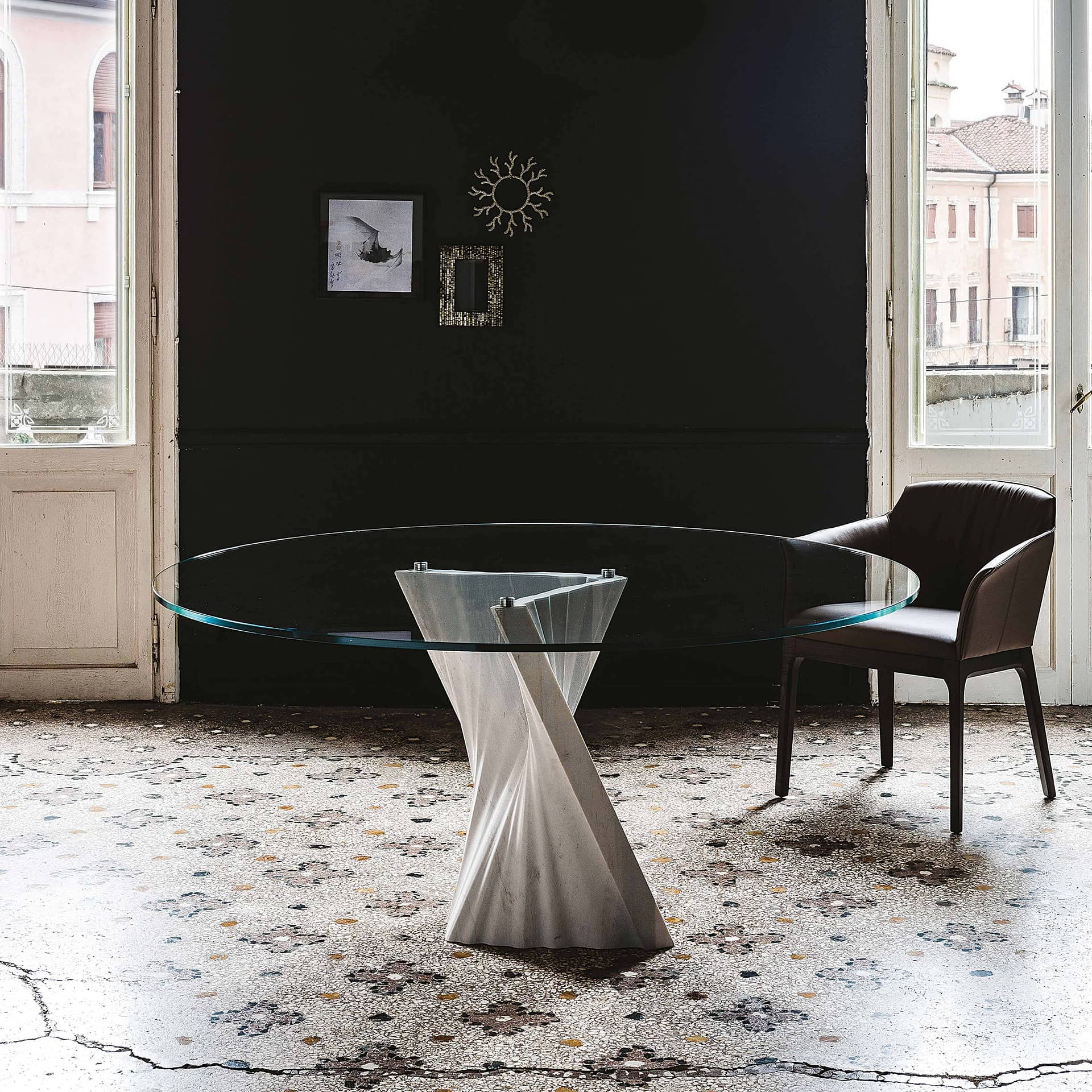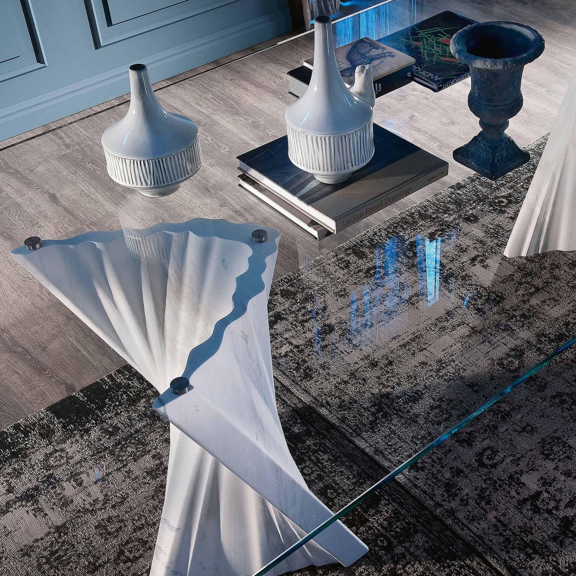 Plisset's glass design table combines precious Palissandro marble with precious crystal for a fascinating combination. As the light passes through the glass, the sinuous lines of the base create a fascinating play on light and shadow similar to sculptured drapery in Greek tradition. With Plisset, you are able to balance modernity in a designer living room with classicism that stems from the traditional marble processing of Cattelan Italia's first products.