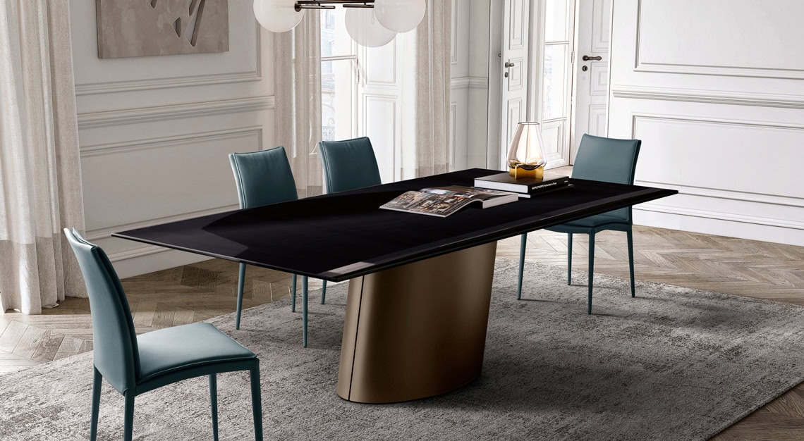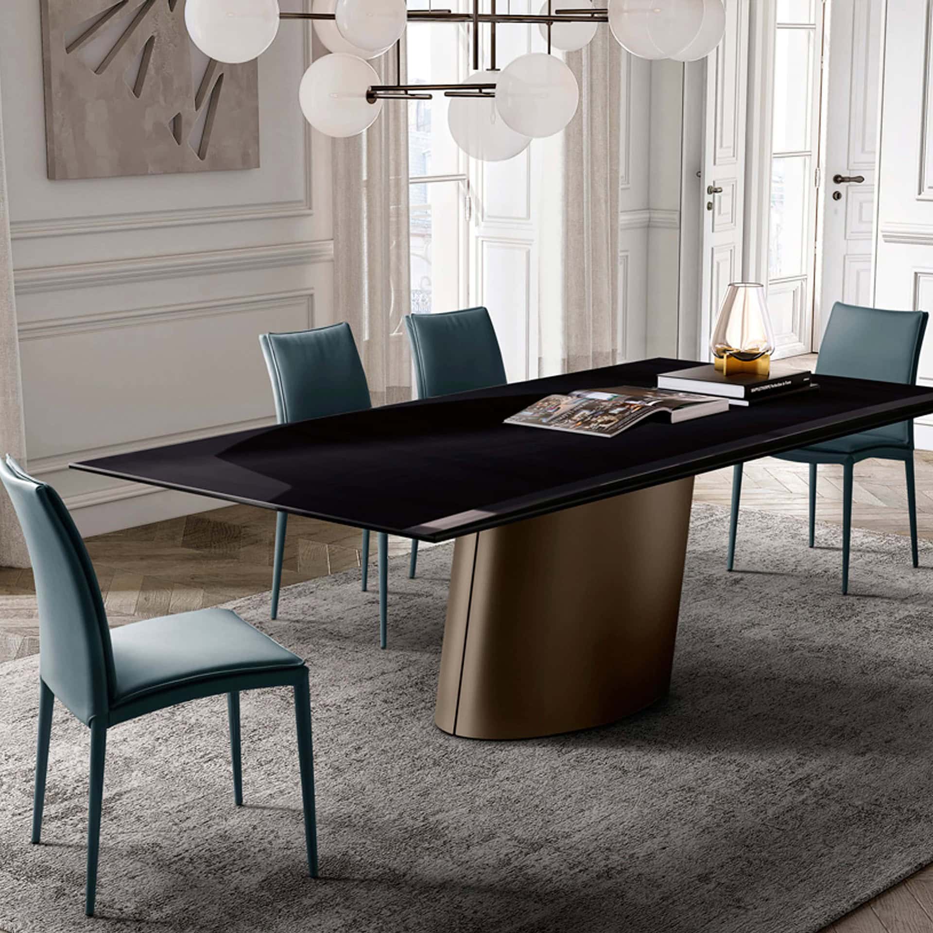 The Dorado Dining Table is an extremely powerful table in the form of a Doric column. A sense of movement is created when the canonical stability is questioned. This table is available with a glass, wood, ceramic, or marble top, with a rectangular or shaped top on a single base.