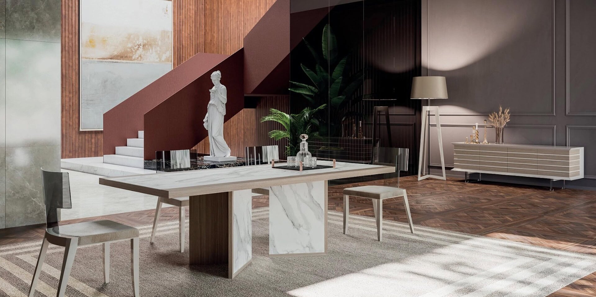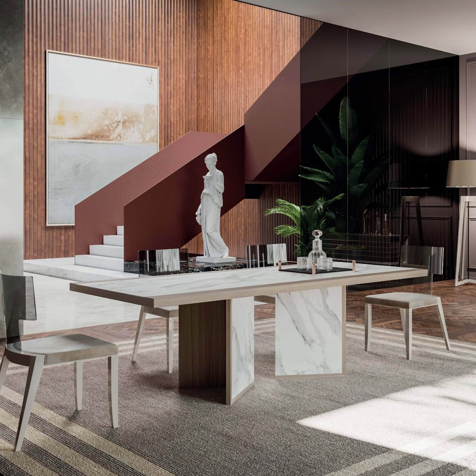 The Jet Set Dining Table is a harmonious dining room piece that creates a unified and simultaneous composition of wood and ceramic.