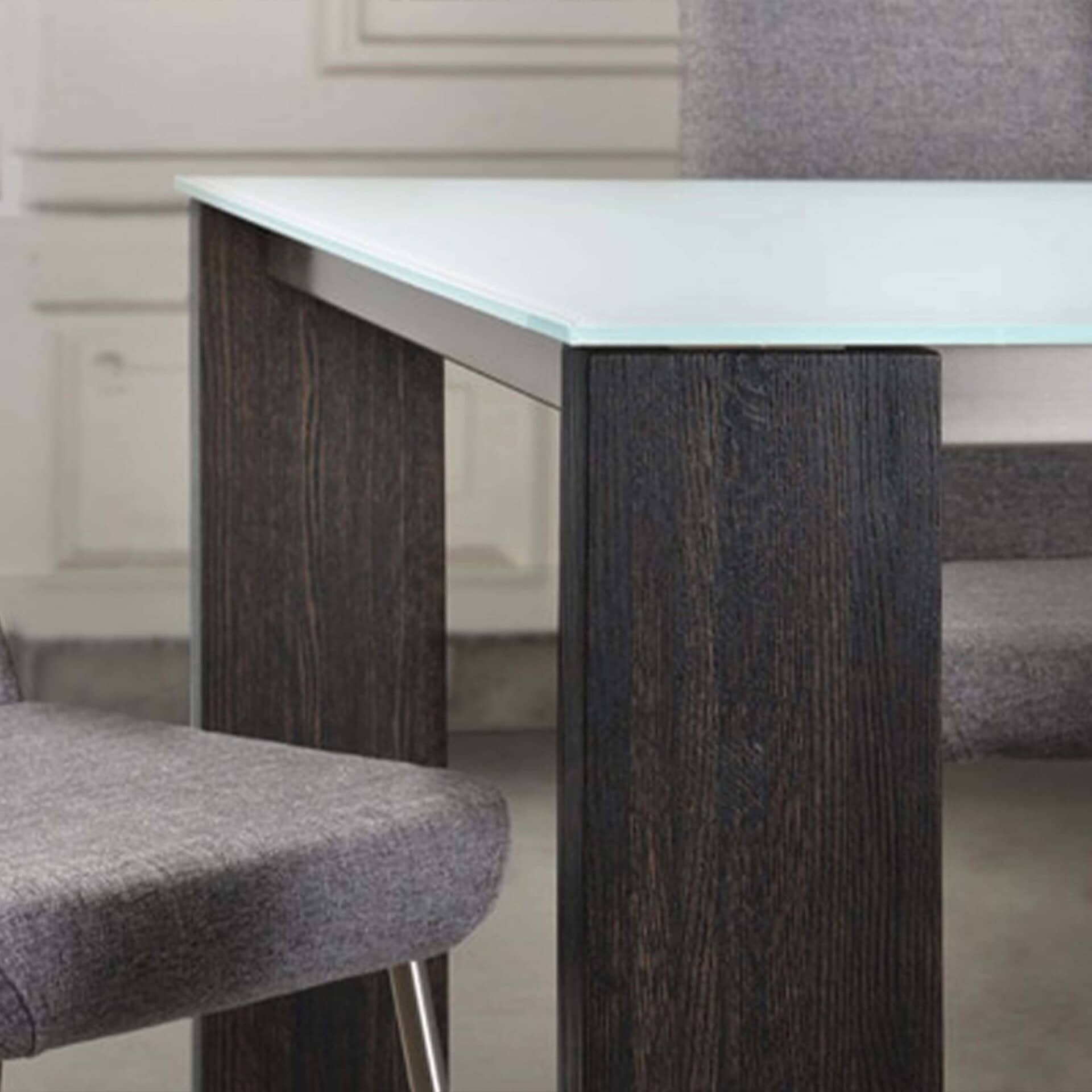 Trica's Empire Glass Table creates the perfect harmony and balance between the use of mixed materials. With its glass top combined with its sleek, sturdy, wooden legs, this dining room table is designed to provide an enhanced and elevated dining experience in a modern way.