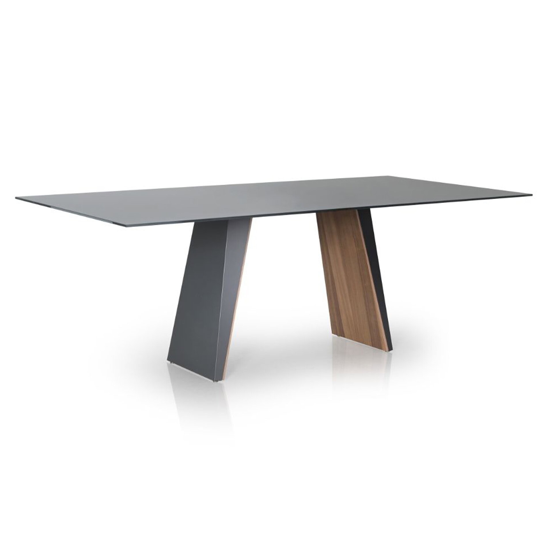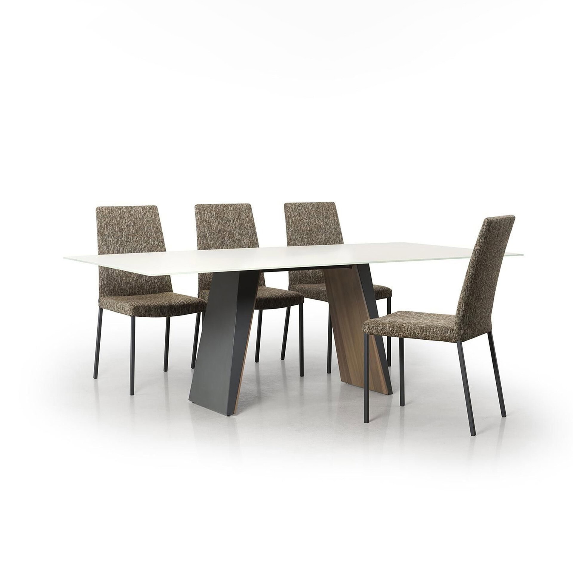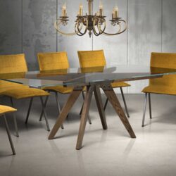 Table base is a combination of metal and wood veneer or solid oak. The tabletop is tempered glass (solid wood if you choose the wood base).