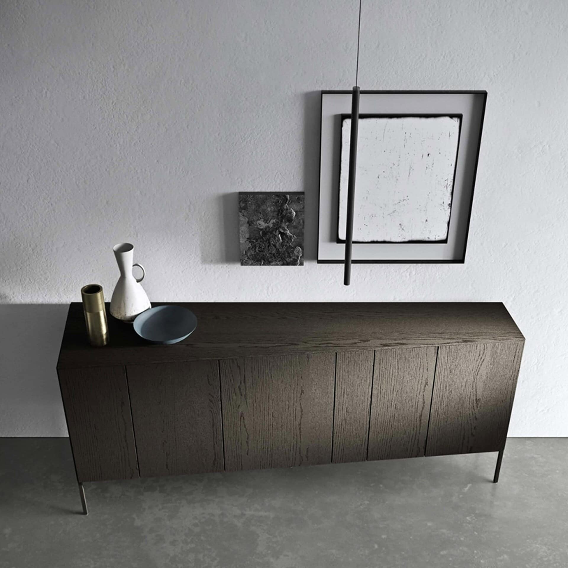 The Inclinart Sideboard is a modular system that changes the rules of how a unit is constructed. Its axis becomes variable, and so do the depths of the tops. In this way, space is perceived and used differently: the tops are no longer parallel to the wall, but slant away from the onlooker who can enjoy the new perspectives created by the differing degrees of rotation. However, storage capacity remains unaffected by changing physical space, as well as how it is perceived, making it an indispensable bonus based solely on rationality. Inclinart is available with concealed feet, with a methacrylate base or wall-hung.