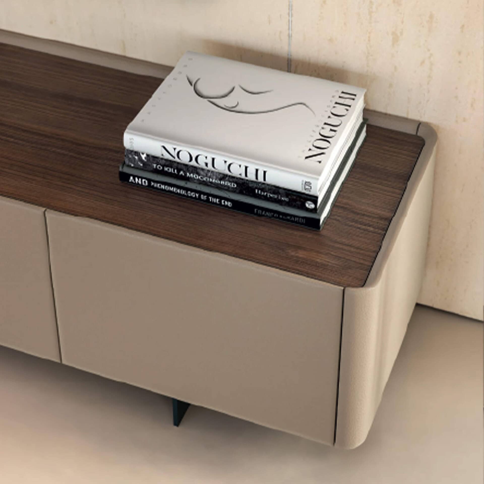 The Alma TV Unit is inspired by the sideboard; smooth and elegant shapes, characterized by the roundness of its angles with workings that enhance the high craftsmanship of the project. Available with lacquered, leather, or eco-leather frame and doors. The top is available lacquered, in veneered wood, or ceramic.