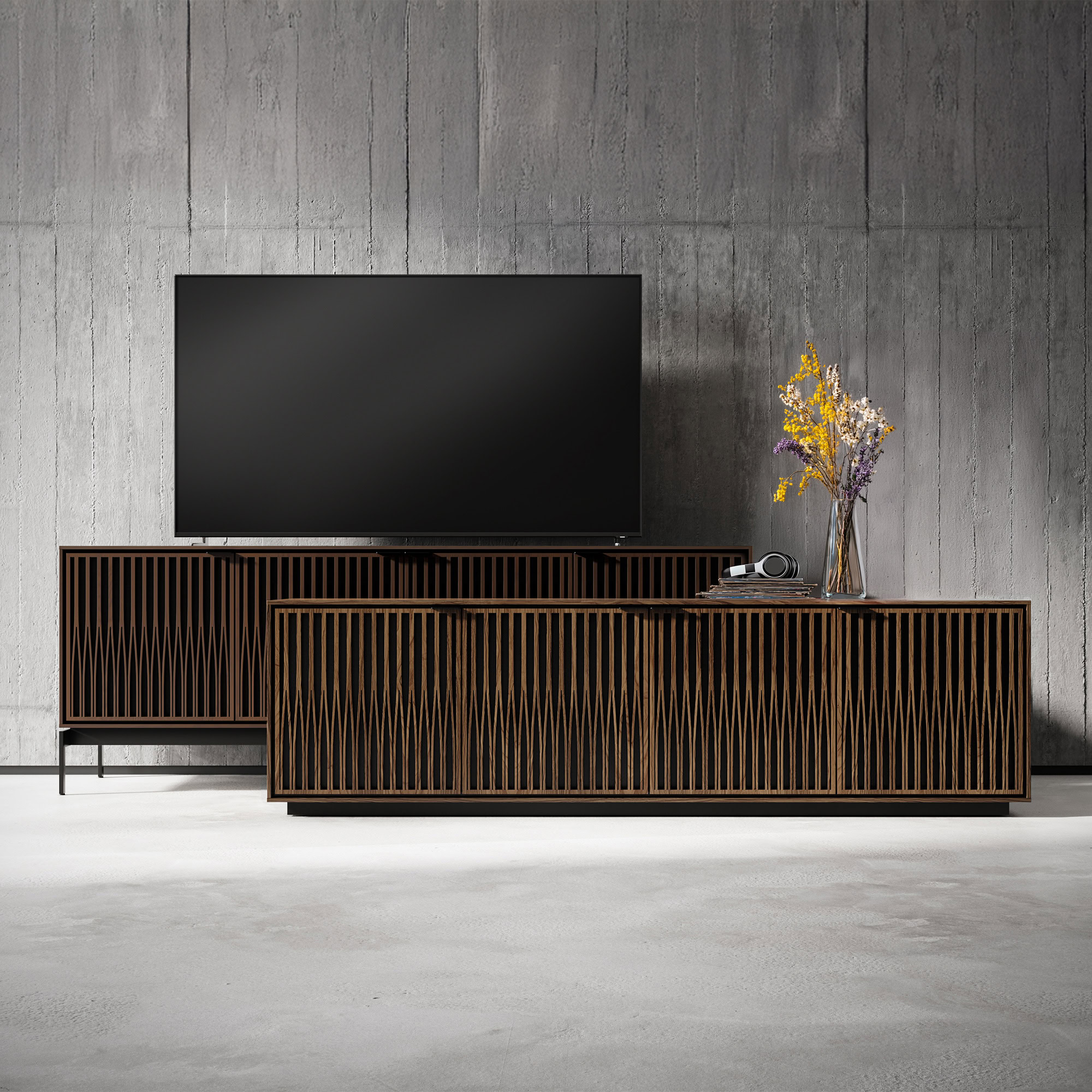 The Elements TU Media Console TV Stand brings together modern rhythm and refined craftsmanship with its signature TUNE door pattern, inspired by the movement of sound waves. Behind its sculptural doors, spacious interiors and adjustable shelving offer flexible storage for media components or everyday essentials, while maintaining a sleek, uninterrupted exterior. Engineered for performance as much as beauty, its perforated metal backing ensures full acoustic transparency—perfect for hidden speakers or soundbars.