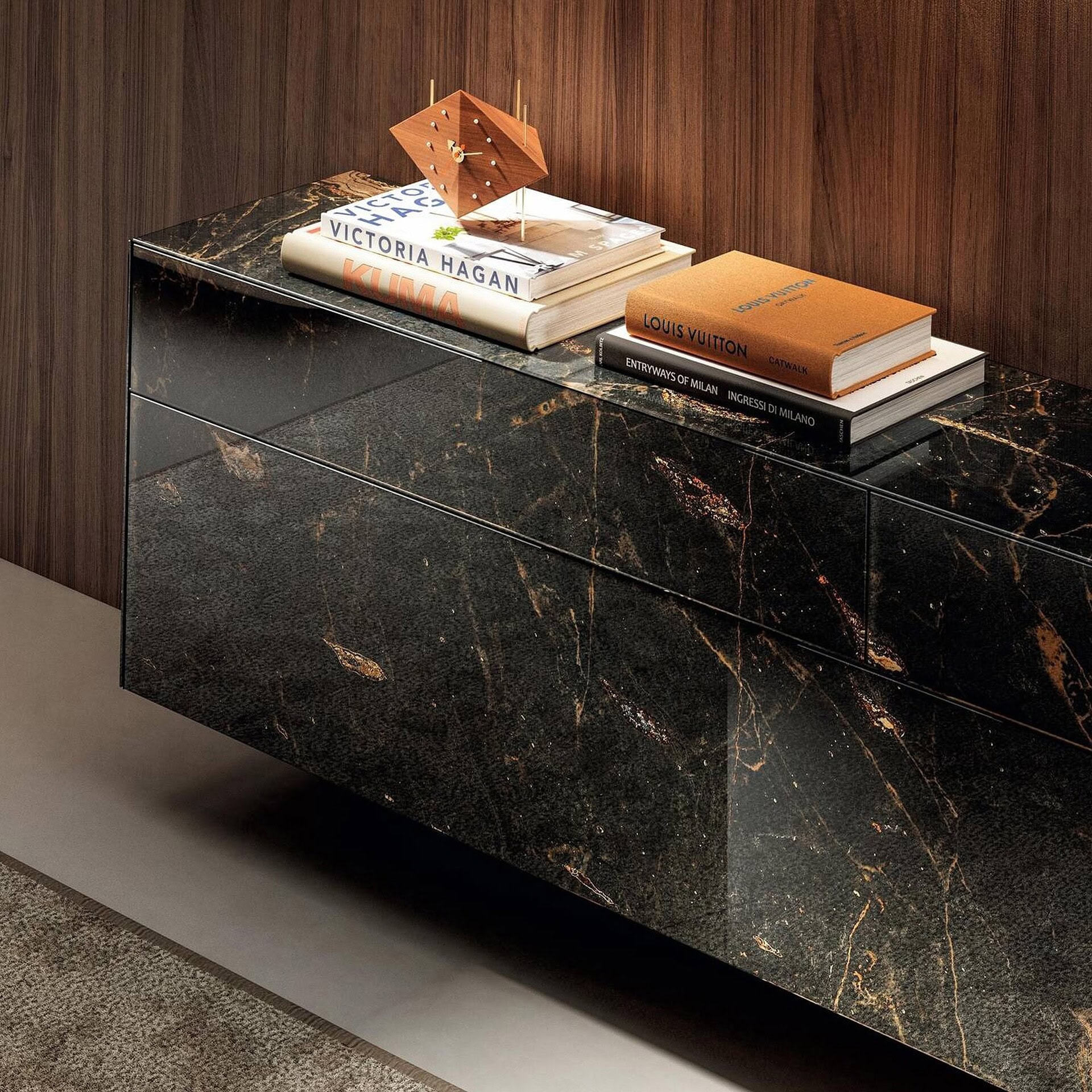 At the core of the Materia Modular TV Wall Unit is LAGO’s innovative XGlass technology, which fuses marble, metal, wood, and fabric textures onto ultra-resistant glass. Continuous veining flows seamlessly across tops, sides, and fronts, reinforcing the unit’s sculptural, monolithic appearance. Integrated glass cableways are built discreetly into the surface, preserving uninterrupted material continuity. From compact media consoles to expansive wall compositions, Materia offers a refined balance of storage, technology, and expressive surface design.