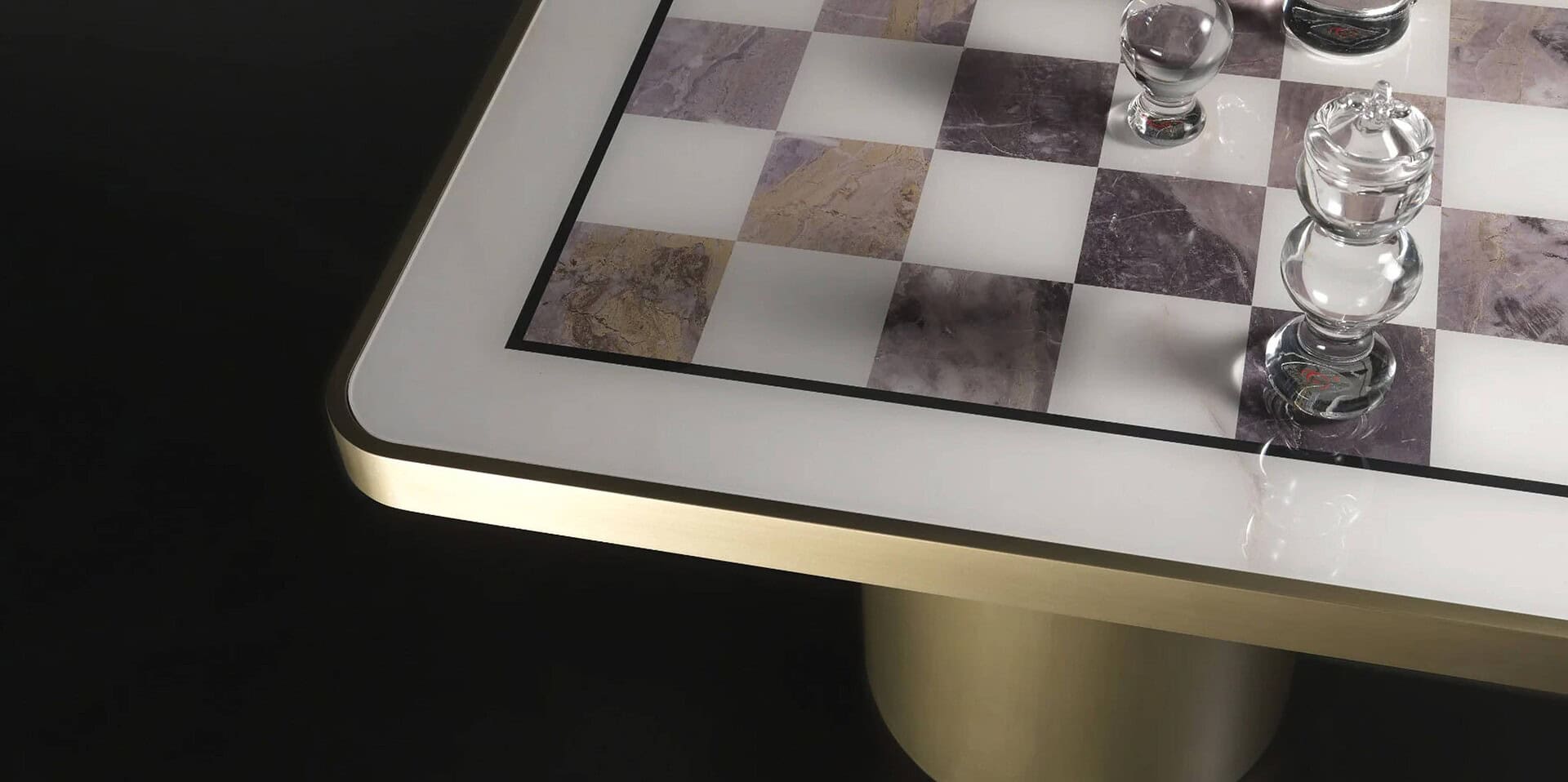 Satin-finished side table with cylinder base in brass, dark brass, titanium, dark titanium. Table top made from wood 40mm thick with the same finish as the base and encased in marble glass with chessboard design in chessboard patterns.