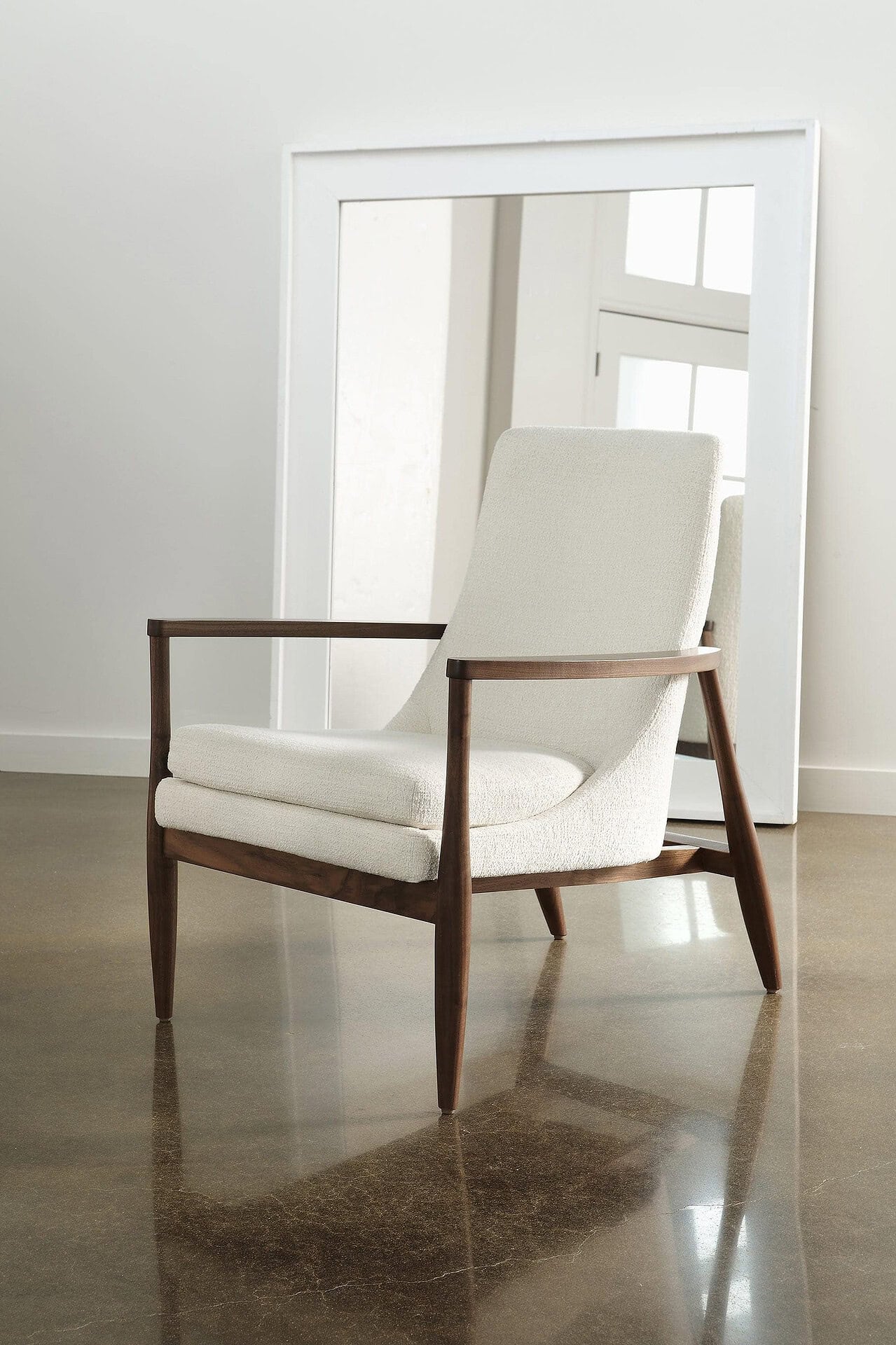 Inspired by Danish modern influences, the American Leather Aaron Arm Chair is a statement piece in any space. The solid walnut base cradling the contoured frame makes it stunning at every angle. With subtle curves and refined style, this accent sofa can easily be paired with several different pieces. Available in leather, fabric and Ultrasuede. Solid natural walnut base.