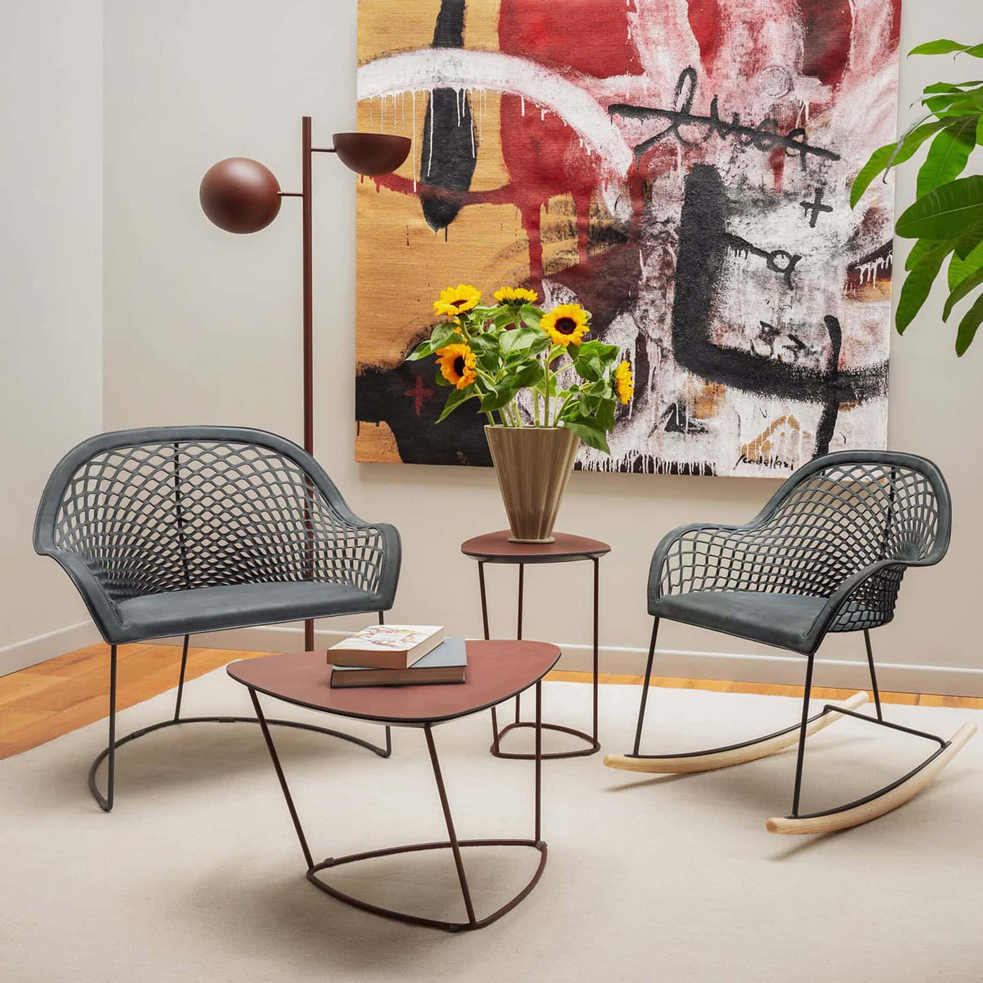 Tubular steel chaise frame in epoxy enamel or polished chrome. Base in sheet and tubular steel with black epoxy finish. Mattress and headrest in expanded foam covered in leather or cowhide.
