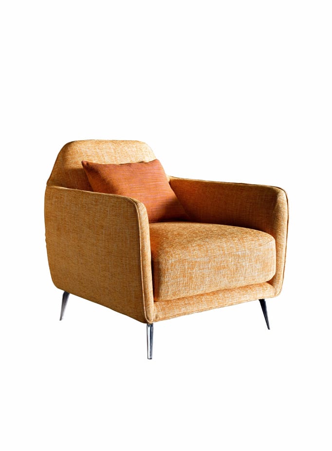 Plywood and pinewood structure completely covered in Tecnoform; cellulose springing; polyurethane cushions; metal feet available in lacquered Anthracite, Gypsum, Dark brown, or shining chromium finishing, or with surcharge in black chrome finishing; fabric, microfibre, leather and artificial leather finish options.